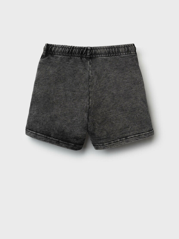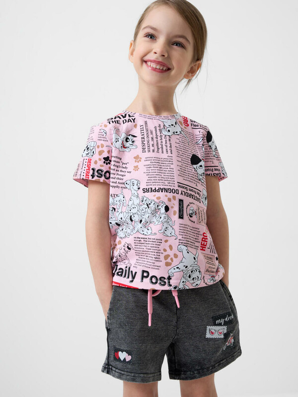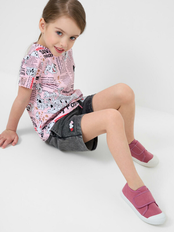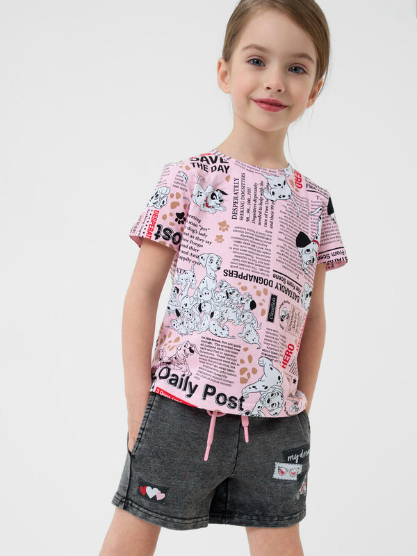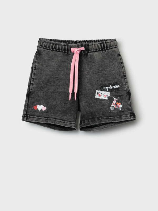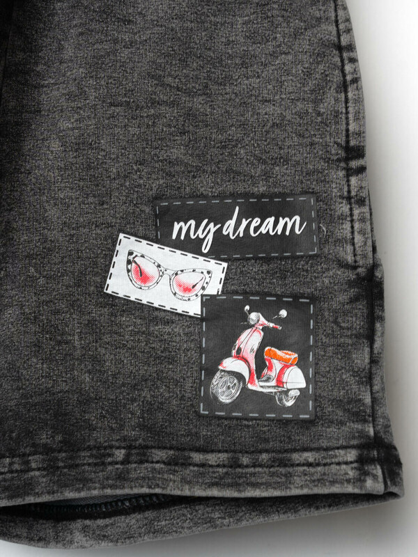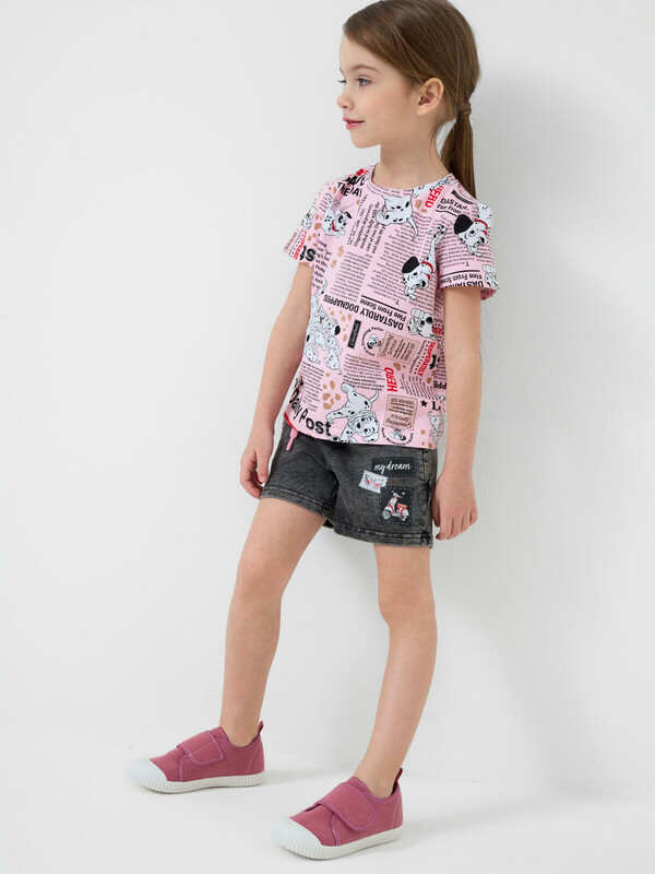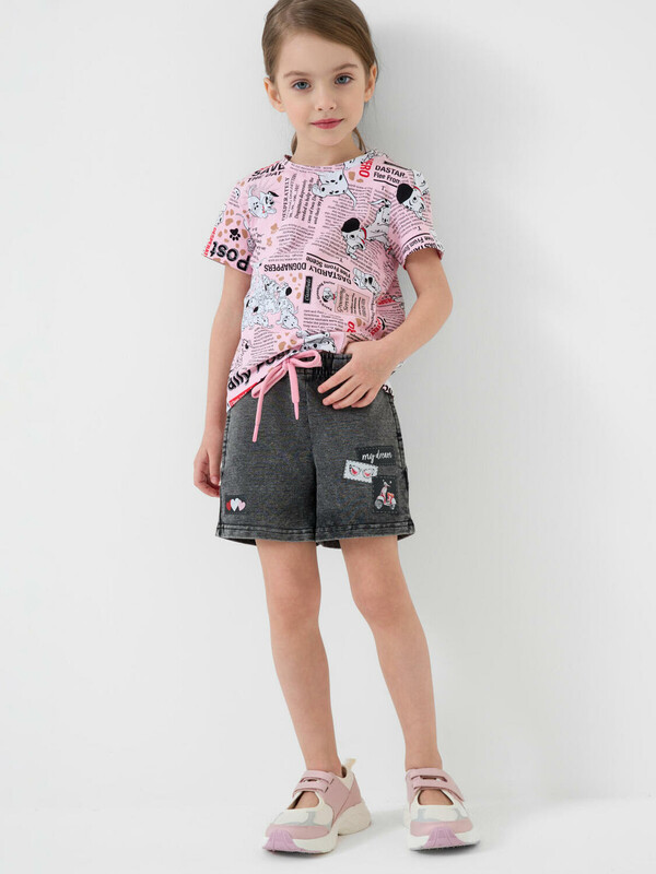 Детские шорты короткие для девочки. Модель свободного кроя. Материал визуально похож на деним, но имеет все кажется хлопкового трикотажа. Удобная посадка обеспечивается эластичным поясом со шнуром. Спереди расположены два боковых кармана. Декоративные нашивки.