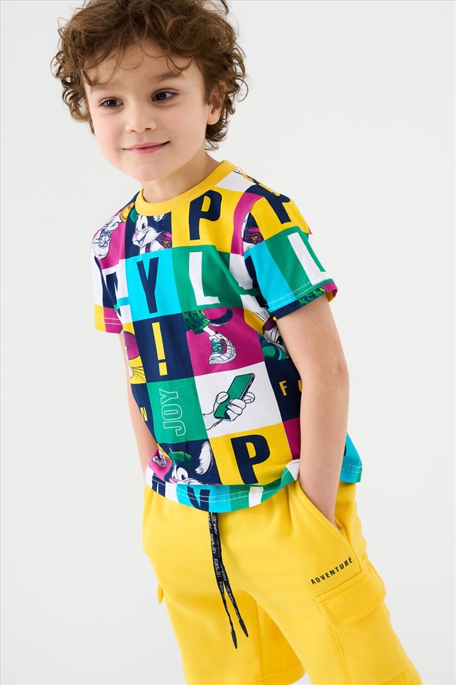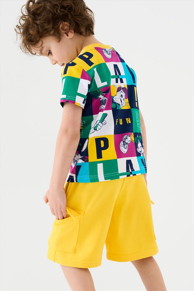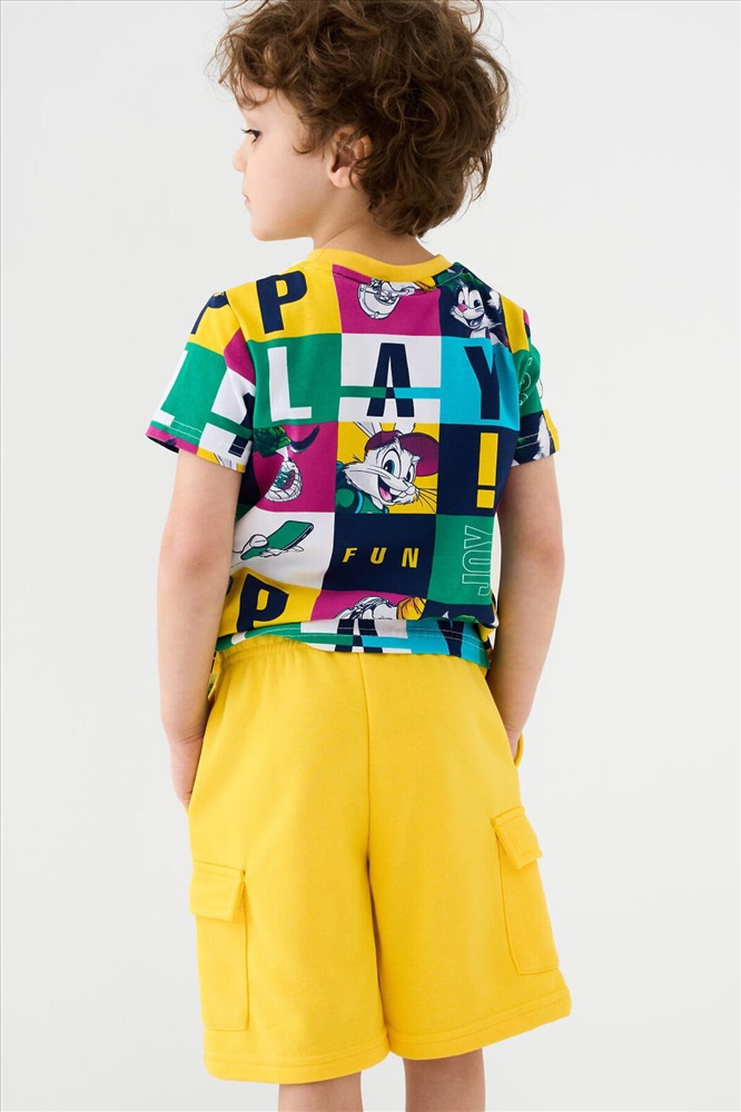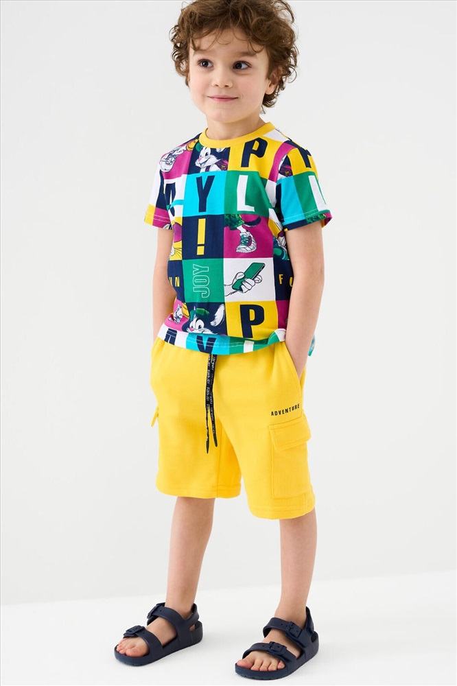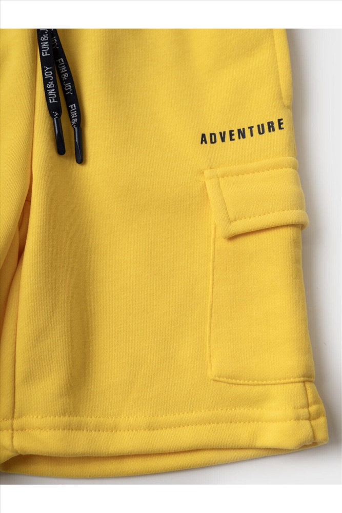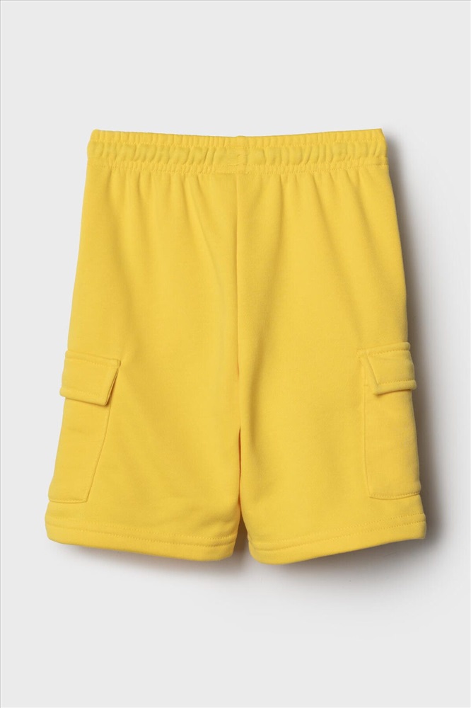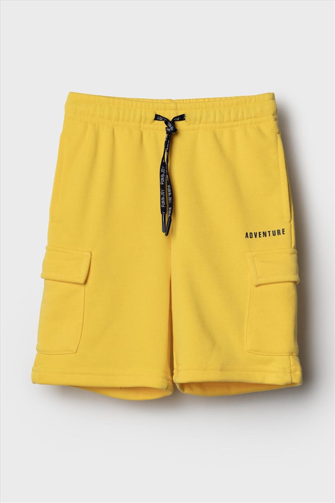Шорты детские для мальчика. Модель свободного кроя из мягкого, хлопкового трикотажа футер. Удобная посадка обеспечивается эластичным поясом со шнуром. Спереди — боковые карманы и накладные карманы-карго.