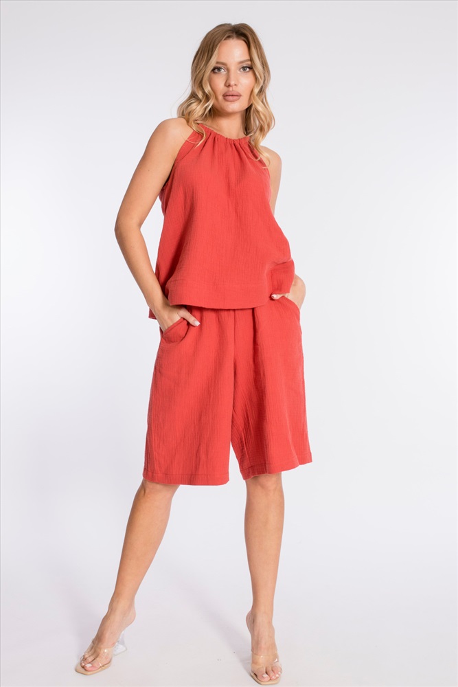 Цвет Номенклатуры: терракотовый Шорты удлинённого, свободного силуэта выполнены из хлопкового полотна - муслина. Пояс с резиной внутри, по бокам расположены карманы.