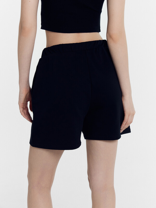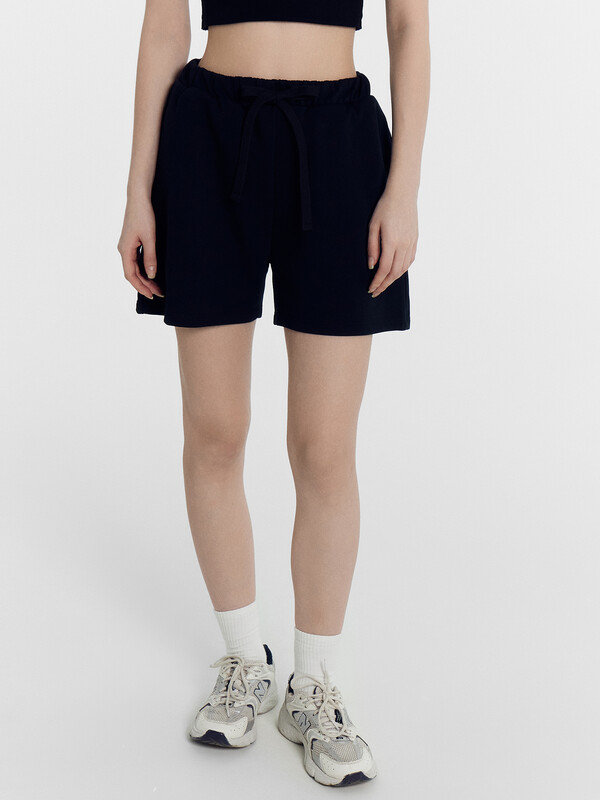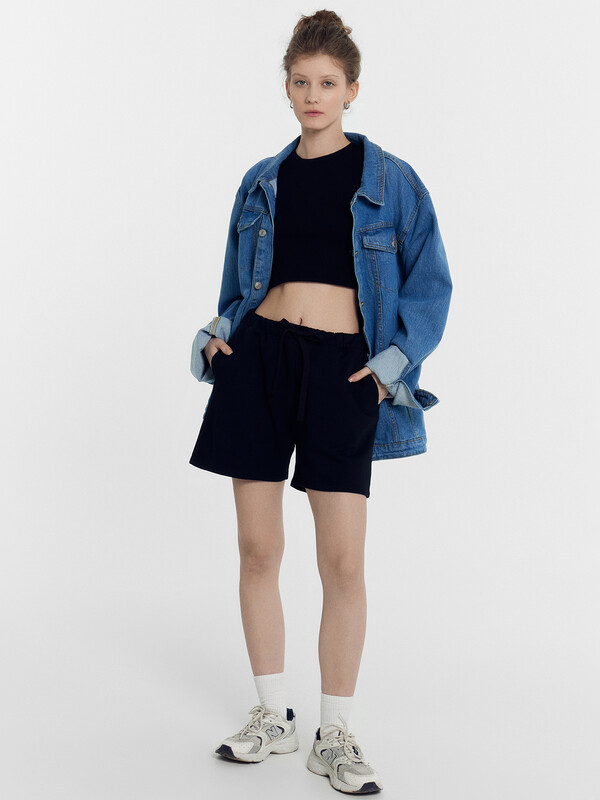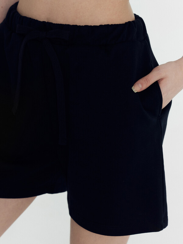 Мини-шорты свободного силуэта из легкого трикотажного футера. Высокая посадка на талии, эластичная тесьма в поясе, регулировочный шнурок-завязка и удобные боковые карманы – комфортный минимализм!
