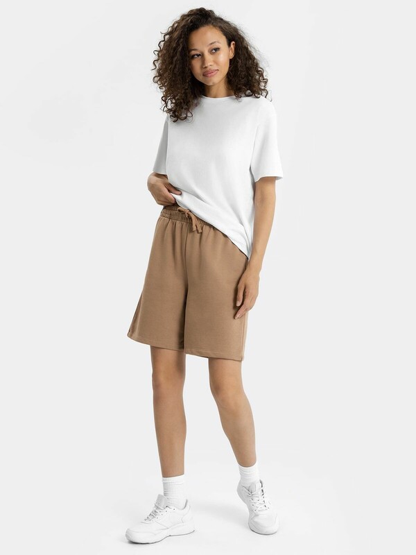 Короткие свободные шорты с высокой линией талии. Изготовлены из трикотажного футера. Пояс – с эластичной тесьмой внутри и шнуром-завязкой. Есть удобные карманы. Стильно!