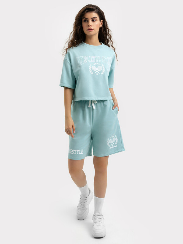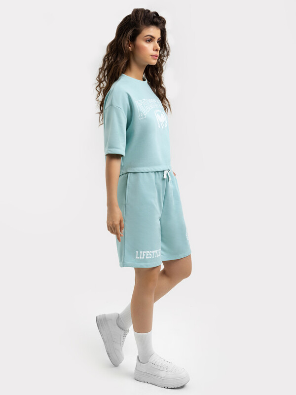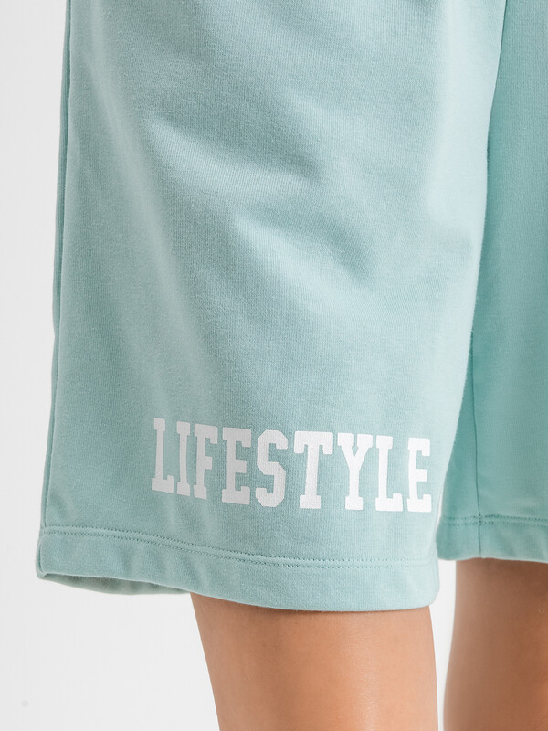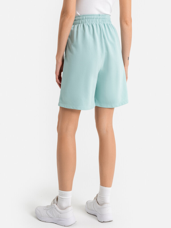 Короткие свободные шорты с высокой линией талии. Изготовлены из трикотажного футера. Пояс – с эластичной тесьмой внутри и шнуром-завязкой. Есть удобные карманы. Стильно!
