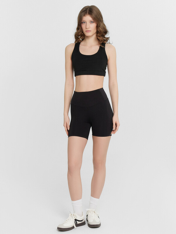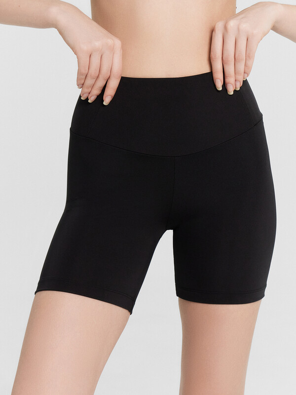 Шорты облегающего силуэта, с высокой посадкой, длиной выше колен. Пояс отрезной, широкий, спереди фигурный. Внутри, по верхнему срезу пояса эластичная тесьма. На задней детали пояса обработан карман в шве, на подкладке из сетки. Шорты без бокового шва, с ластовицей. Нижние срезы обработаны швом вподгибку. 72% полиэстер; 28% эластан Комментарии к товару