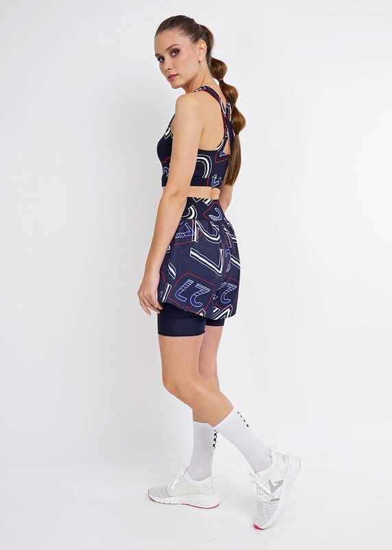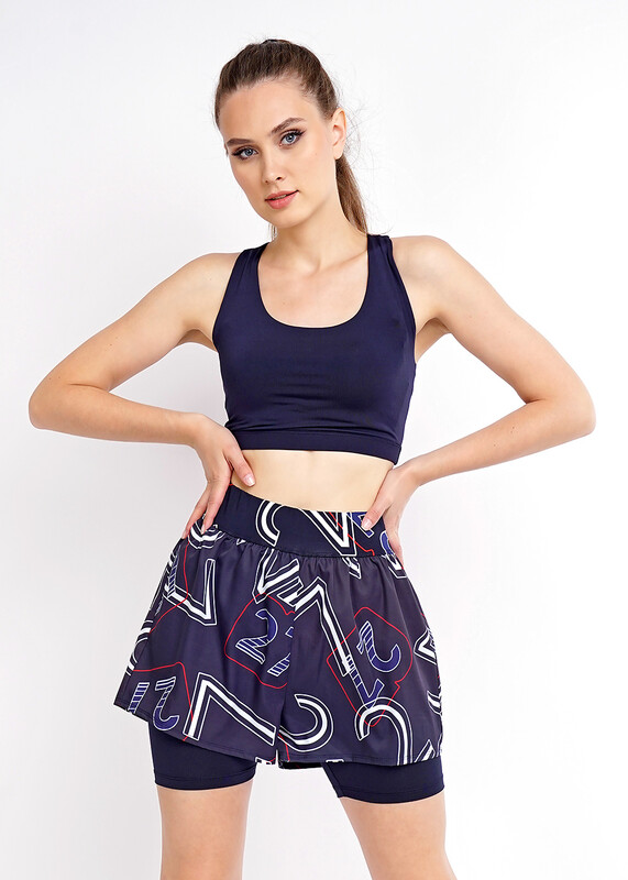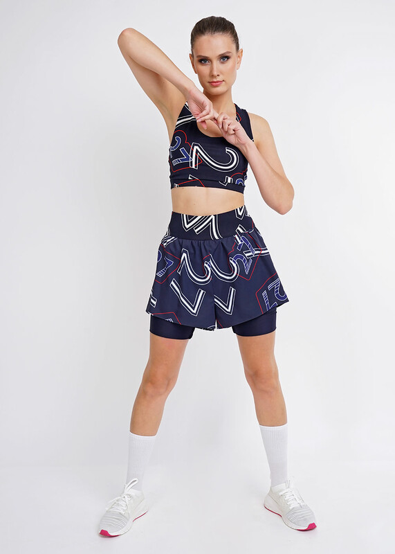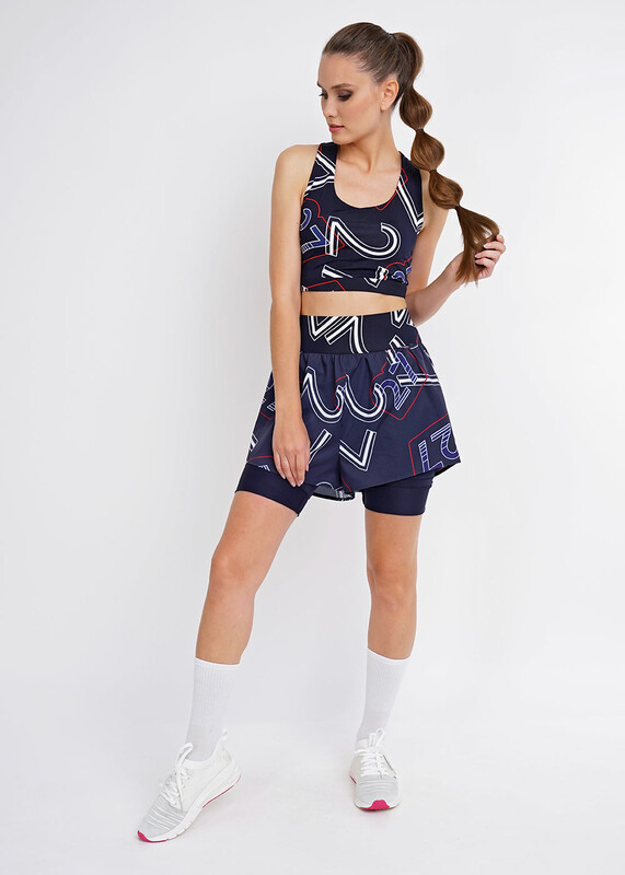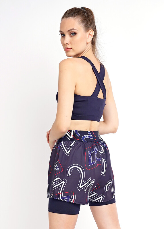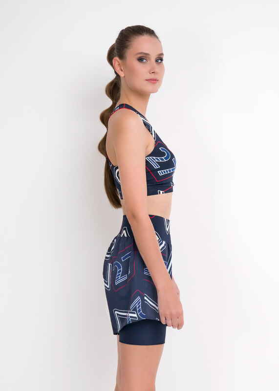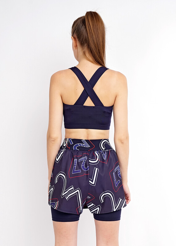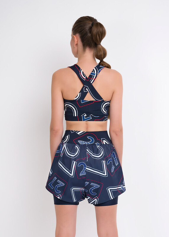 Двухслойные шорты: нижний слой - велосипедки из ПЭ полотна, верхний слой- объемные короткие шорты из плащевки с яркой, динамичной набивкой. По талии - отрезной пояс на внутренней резинке, по низу изделия - широкая подгибка.