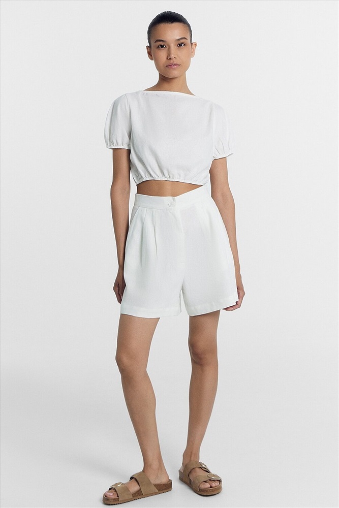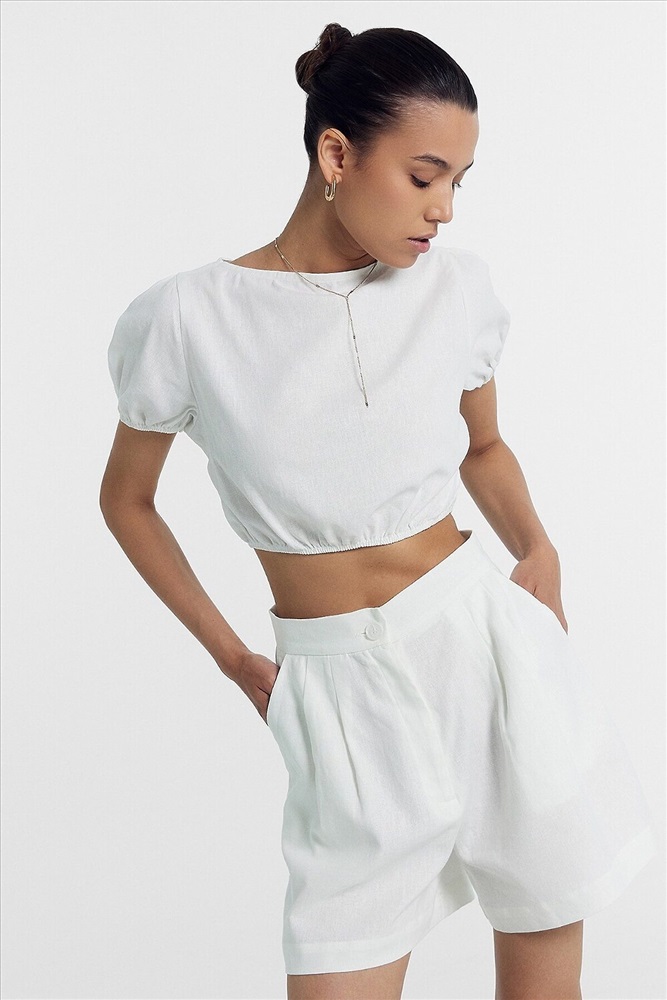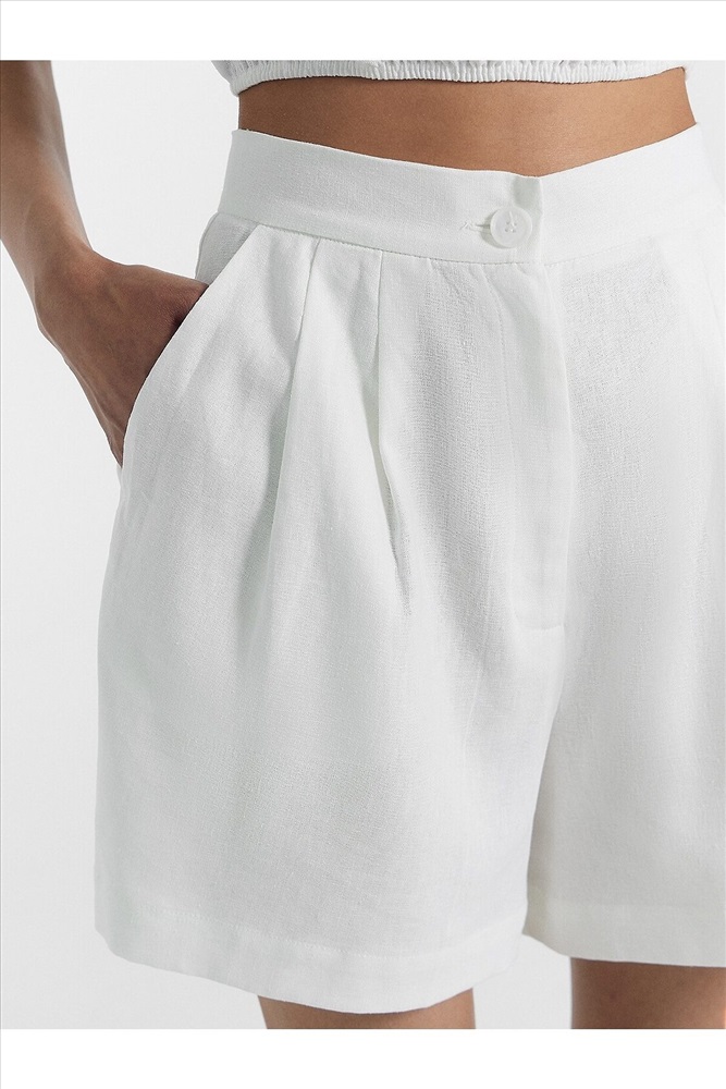 ID товара: 1042970 Состав: 55% лен; 45% район Сезон: Весна/Лето Длина: Короткая Фасон: Свободный Вид застежки: Молния Посадка: Высокая Тип карманов: С отрезным бочком Декоративные элементы: Складки Основная ткань: Лён Стиль: Повседневный Уход: Деликатная стирка при 30 градусах Особенности модели: Нет Фактура материала: Тканое полотно Страна бренда: Беларусь Шорты женские из ткани, с посадкой на линии талии. Верхний срез обработан отрезным поясом из основного полотна. Центральная застежка на молнию и пуговицу. Пуговица. На передних половинках обработаны косые карманы от пояса к боковым швам с отрезным бочком. По верхнему срезу заложены по две односторонние складки. На задних половинках обработаны талевые вытачки. Низ обработан швом вподгибку с закрытым срезом, с широкой подгибкой Комментарии к товару
