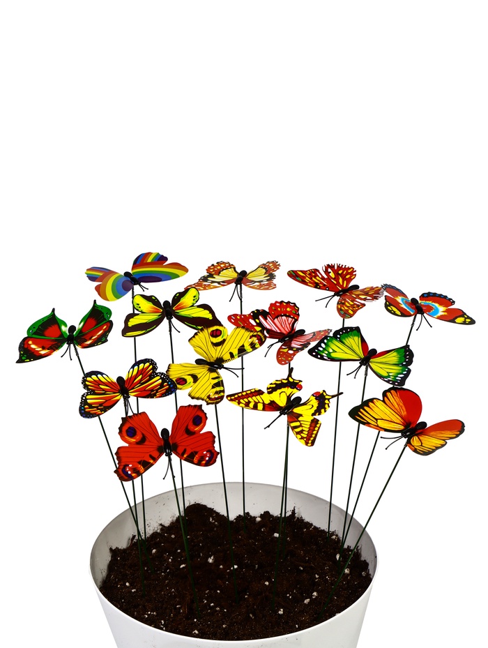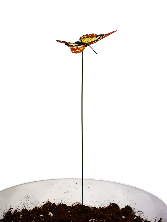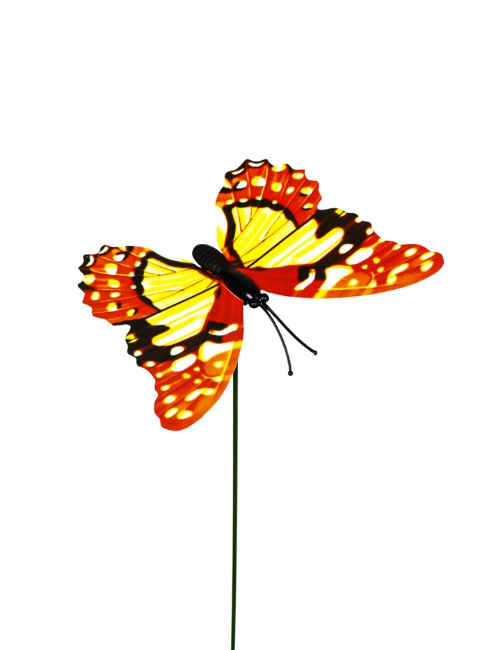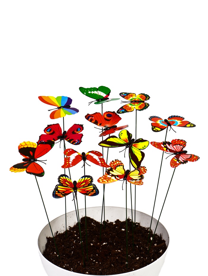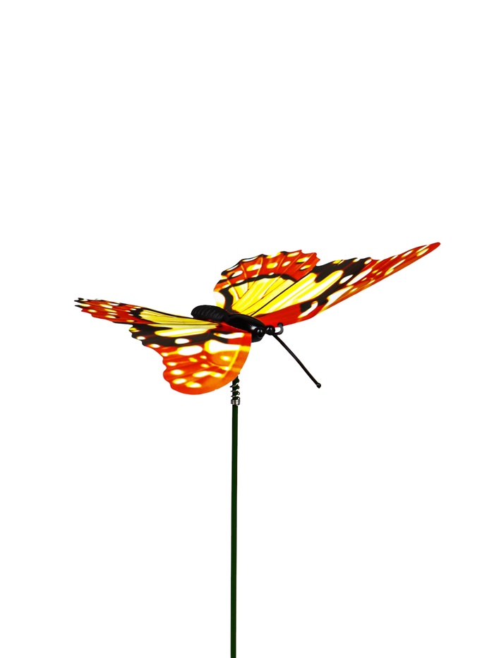 - Выразительный размер: при общей высоте 30 см фигурки бабочек 7×7 см хорошо читаются на фоне растительности. Формат крыльев создаёт чёткий геометрический акцент в природном окружении.