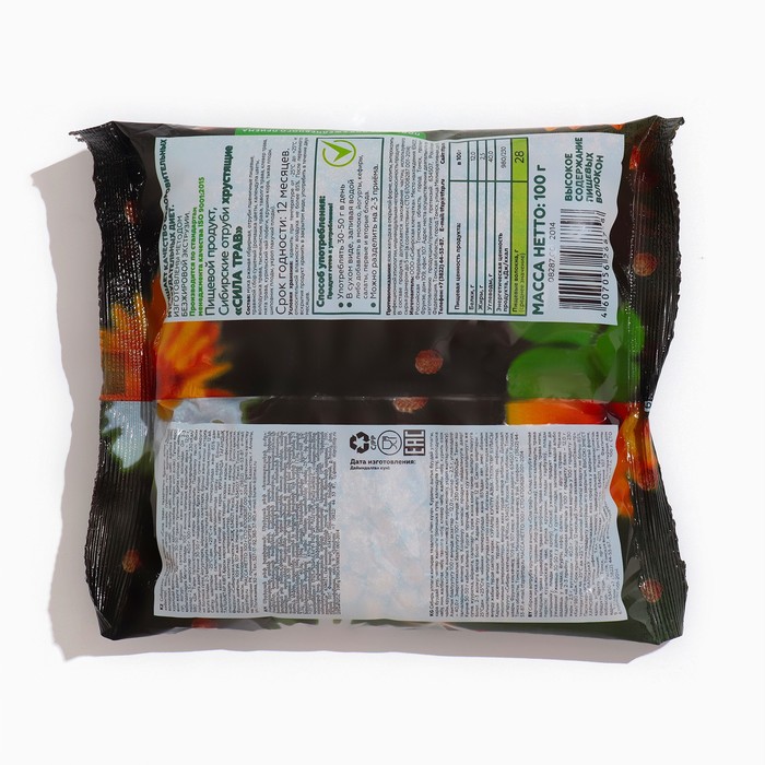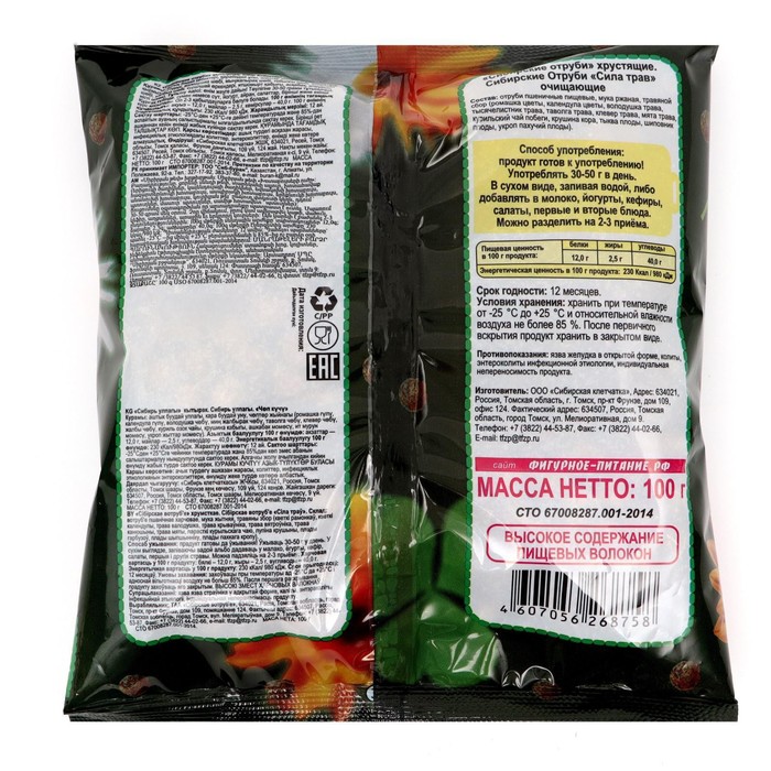 Состав: отруби пшеничные пищевые, мука ржаная, травяной сбор (ромашка цветы, календула цветы, володушка трава, тысячелистник трава, таволга трава, клевер трава, мята трава, курильский чай побеги, крушина кора, тыква плоды, шиповник плоды, укроп пахучий плоды).