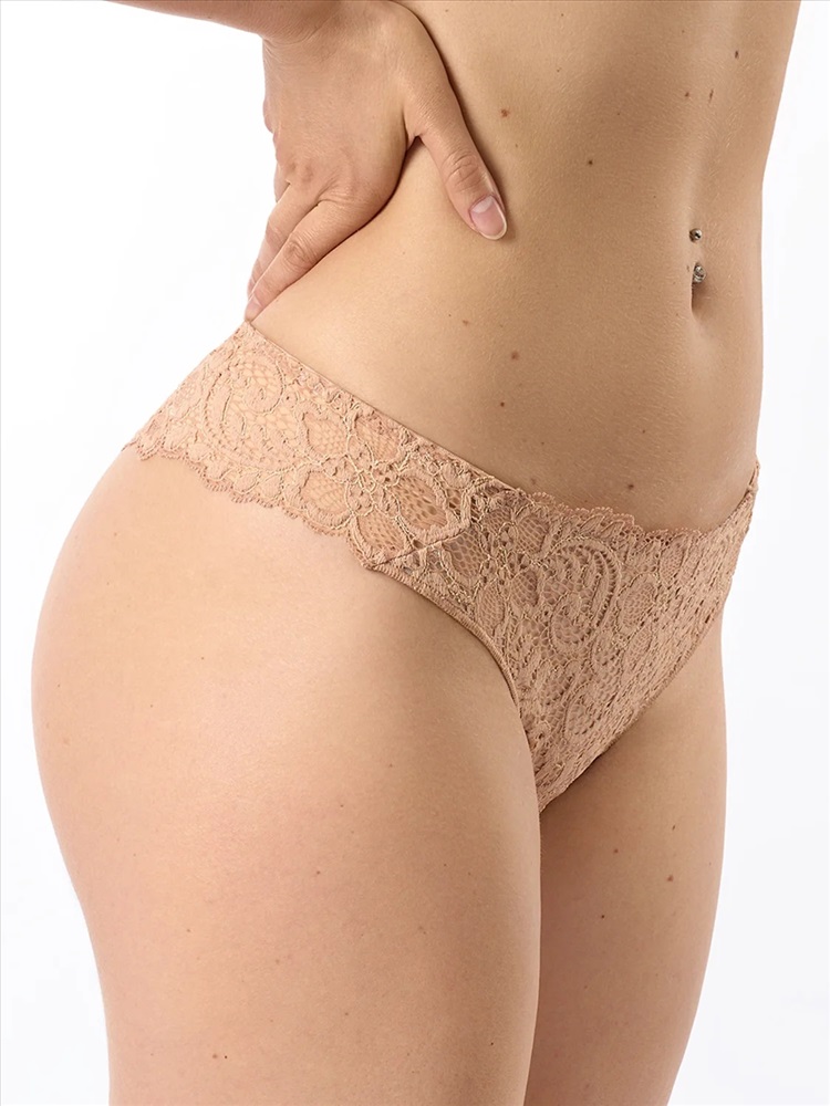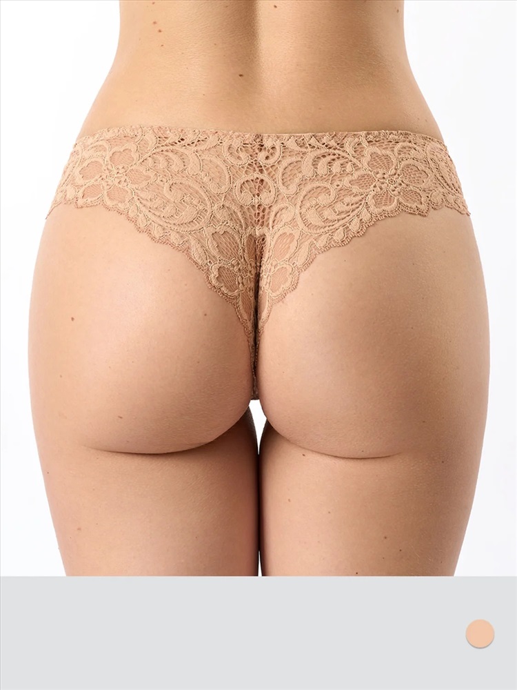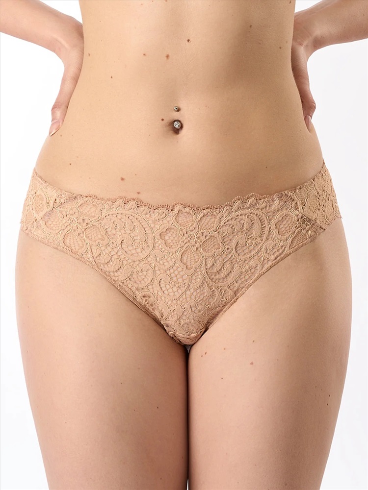 Трусы «бразилиана» из эластичного полупрозрачного кружева со средней линией талии. Спереди продублированы мягкой сеткой. Эффектно подчеркивают бедра, придают им округлую форму и делают фигуру более соблазнительной. Ластовица из мягкого хлопка обеспечивает дополнительный комфорт.