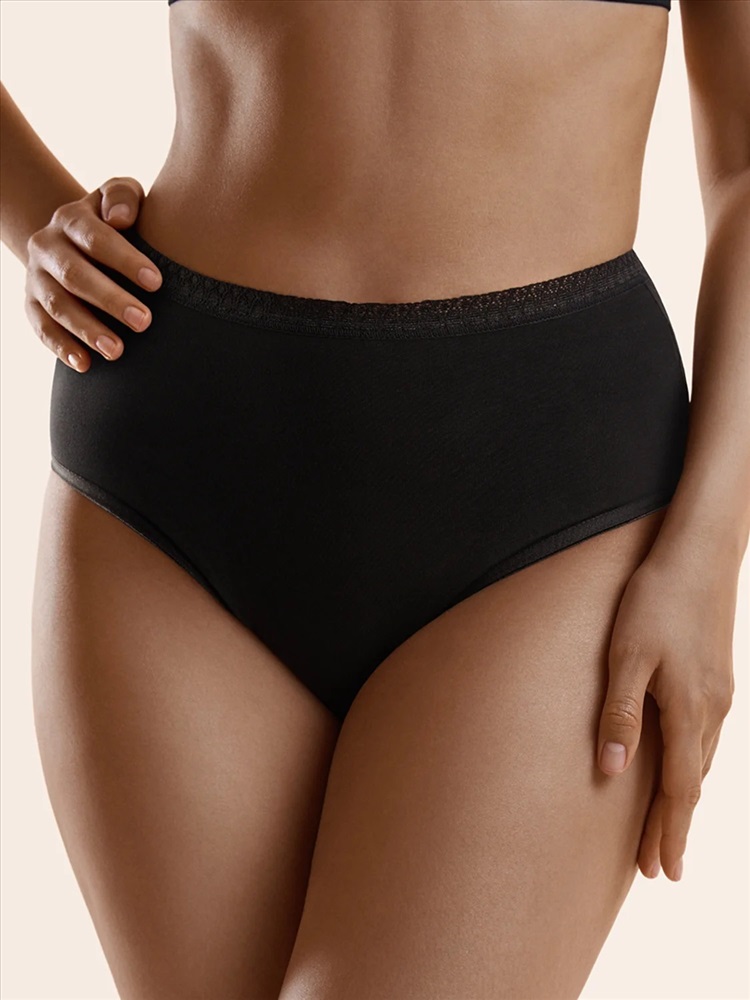 Комфортные трусы-макси с высокой посадкой из качественного хлопка с ажурной эластичной тесьмой по поясу, добавляющей модели женственности и изящества.