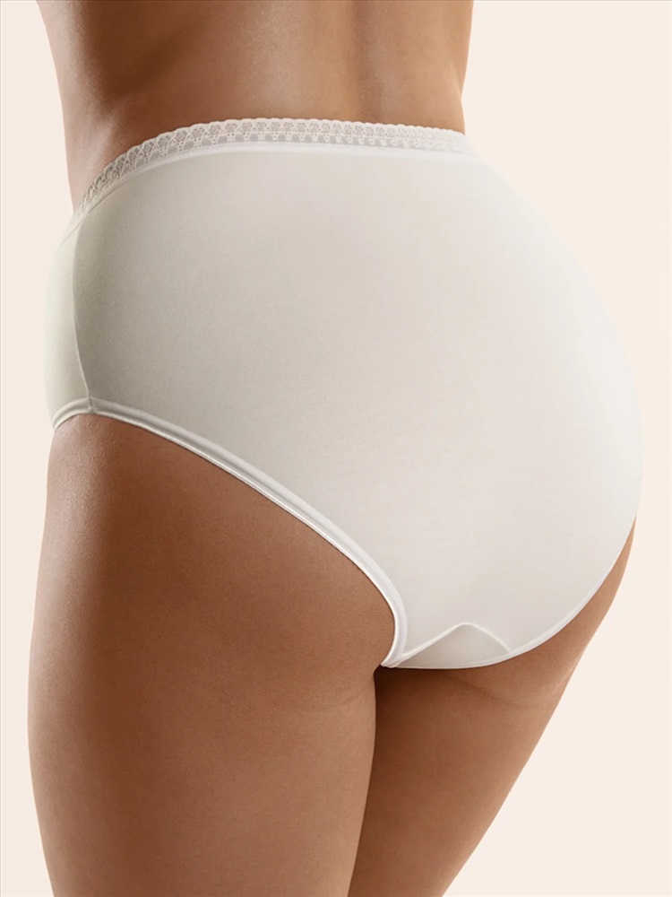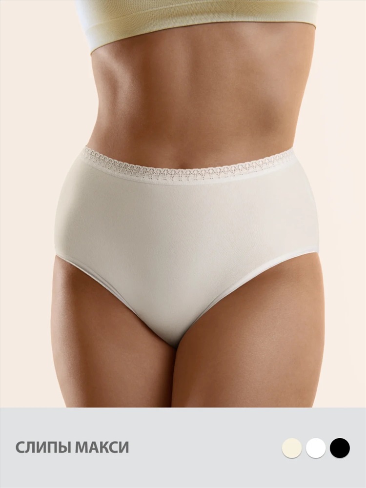 Комфортные трусы-макси с высокой посадкой из качественного хлопка с ажурной эластичной тесьмой по поясу, добавляющей модели женственности и изящества.