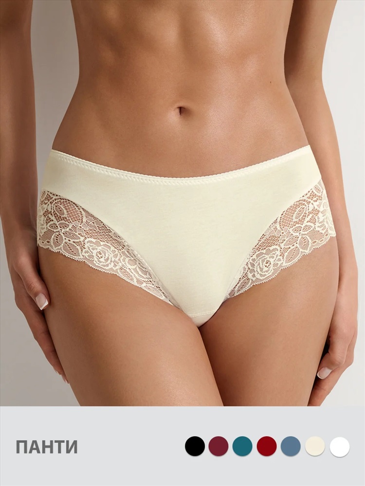 Трусы-панти с низкой посадкой из качественного хлопка и изящными кружевными вставками по ножкам спереди и сзади. Элегантное кружево с цветочным орнаментом придает модели изысканный вид.