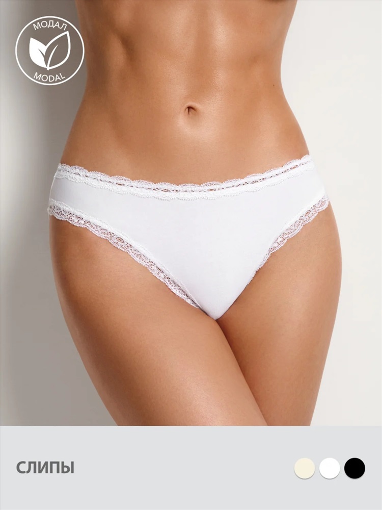 Трусы-слипы с классической посадкой, высоким вырезом по ножке, из модала с эластичной кружевной тесьмой по поясу и ножкам. Модель, сочетающая комфорт и женственный стиль.