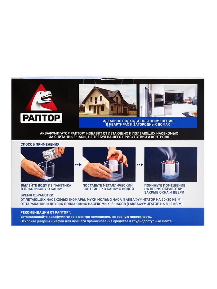 Японское действующее вещество cyphenothrin (цифенотрин) и специальный парообразующий агент помещены внутрь небольшого металлического контейнера, который устанавливается в пластиковую емкость, частично наполненную водой. При контакте с жидкостью начинается интенсивная термическая реакция, в результате которой образуются пары активного вещества, проникающие даже в труднодоступные места. Препарат полностью уничтожает все виды насекомых и их личинки надолго. Действующее вещество Cyphenothrin (цифенотрин) зарекомендовало себя как высокоэффективный нервно-паралитический препарат для уничтожения всех видов насекомых и их личинок, обладающий остаточным действием, что обеспечивает продолжительный эффект. Цифенотрин – инсектицид широкого спектра, безопасный для человека и домашних животных.ИНСТРУКЦИЯВЫЛЕЙТЕ ВОДУ ИЗ ПАКЕТИКА В ПЛАСТИКОВУЮ БАНКУ. ПОСТАВЬТЕ МЕТАЛЛИЧЕСКИЙ КОНТЕЙНЕР В БАНКУ С ВОДОЙ. ПОКИНЬТЕ ПОМЕЩЕНИЕ НА ВРЕМЯ ОБРАБОТКИ, ЗАКРЫВ ОКНА И ДВЕРИ.