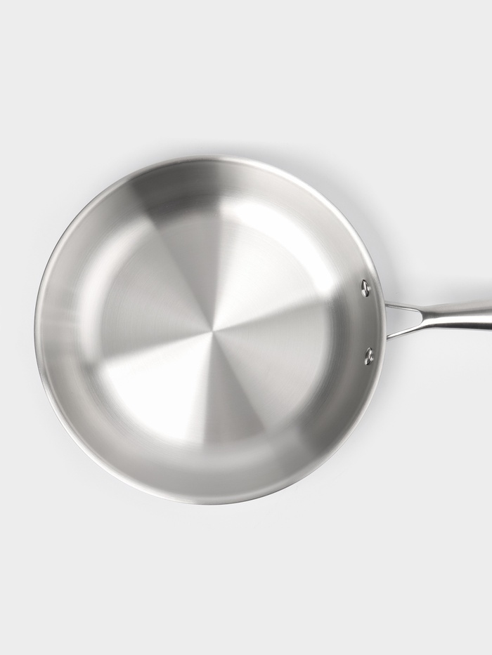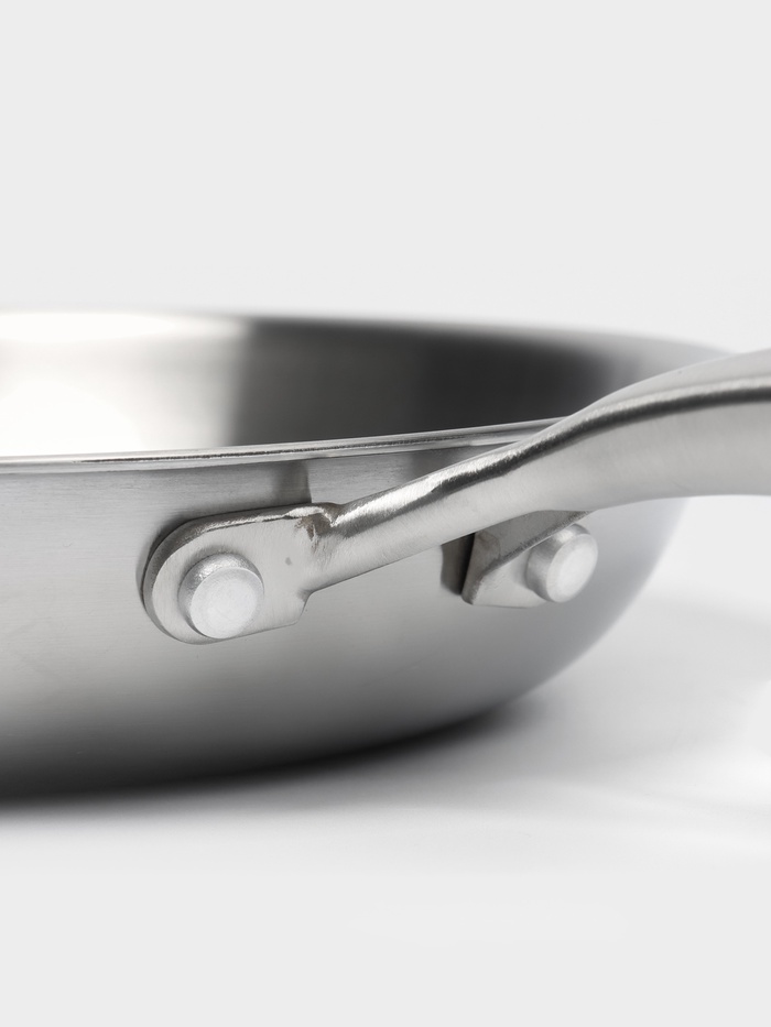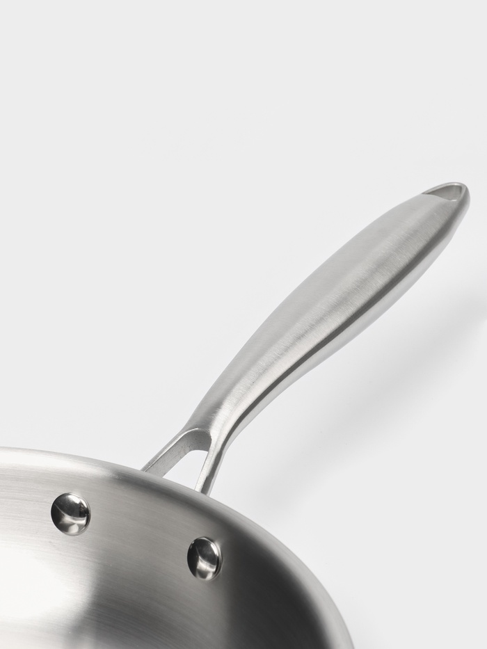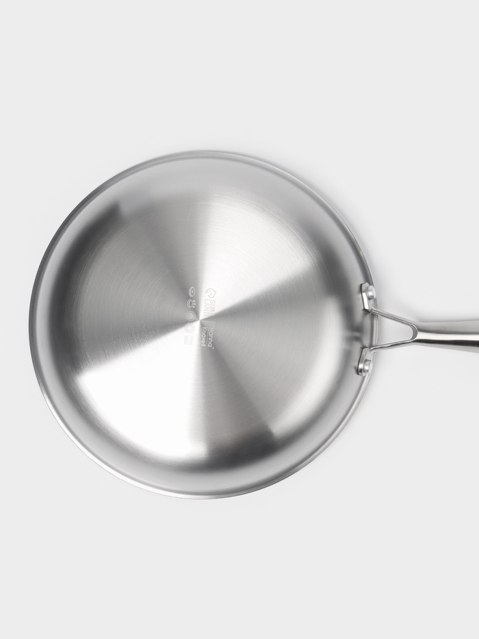 Благодаря технологи 3PLY 3 цельных листа металла объединяются в единую монолитную форму, состоящую из внутреннего слоя нержавеющей стали марки AISI 304, центрального слоя алюминия, и внешенего слоя 430 AISI, что позволяет сковороде работать на любом типе плит, включая индукционные, а также обеспечивает равномерный нагрев и хорошую теплопроводимость, что делает её универсальным инструментом для любой кухни.