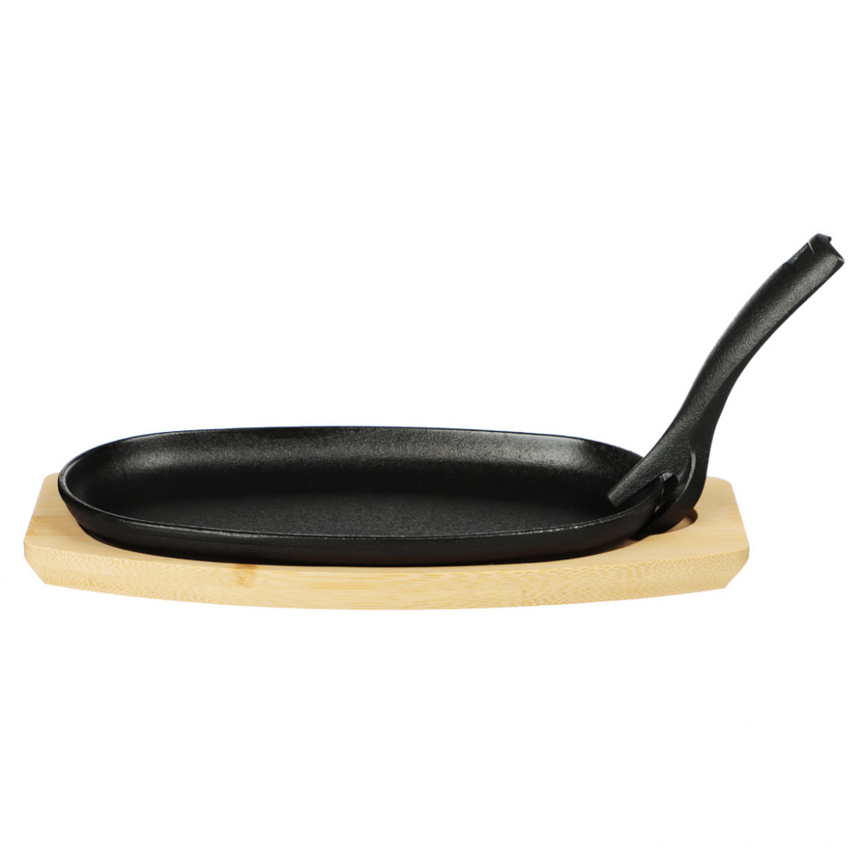 Сковорода чугунная на подставке из бамбука SATOSHI, овальная, со съемной ручкой, размер 24х13,5 см используется для приготовления завтраков и вторых блюд на варочной поверхности или в духовке с последующей подачей готового блюда непосредственно в сковороде на бамбуковой подставке.