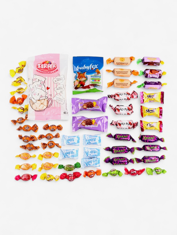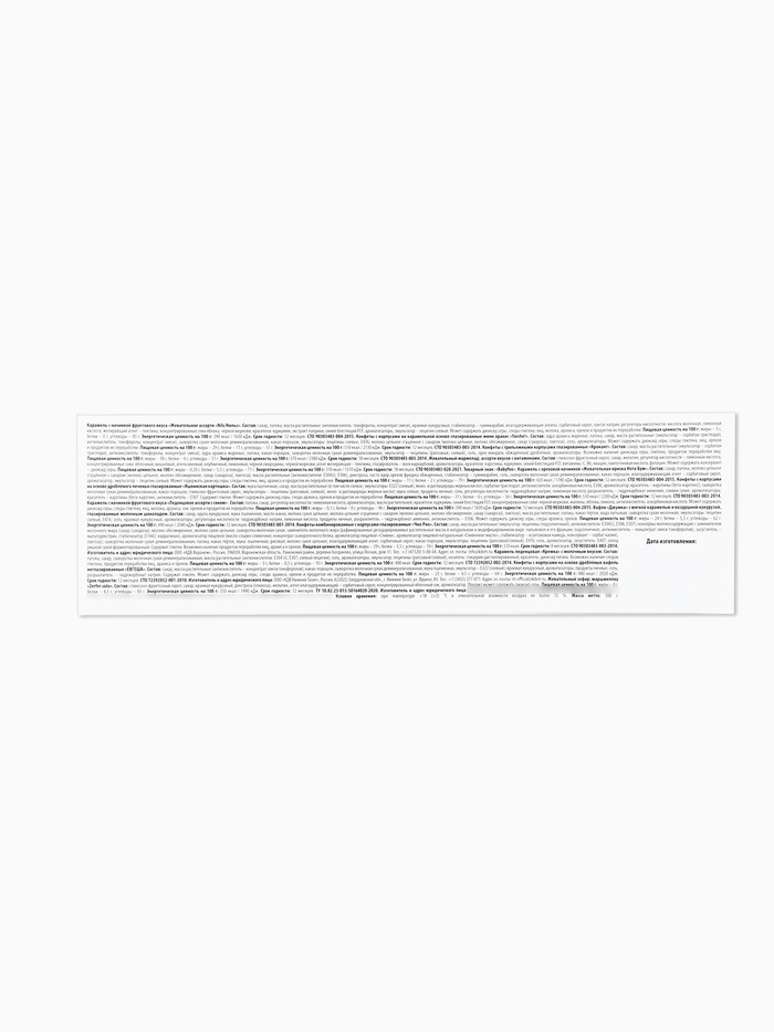 Габариты: 26 x 17 x 8 Страна: Россия В боксе: 24 шт Состав: См. на упаковке Материалы: см. на упаковке Фасовка: по 1 шт Индивидуальная упаковка: Пакет (БОПП, полиэтилен, ПВХ, дой-пак) Сертификат: ЕАС Набор: Да Цвет: Разноцветный Для кого: Для мальчика, Для девочки В наборе, шт.: 51 Вес нетто, г: 500 Вид упаковки: Подарочная коробка Символ года: Нет Тематика праздника: Новый год Адресат: Без адресата Вкус: Ассорти Составляющие набора: Конфеты, Раскраска Возраст: Для детей ПРИ ОФОРМЛЕНИИ ЗАКАЗА, ПРОСИМ ЗАПРАШИВАТЬ АКТУАЛЬНЫЕ СРОКИ ГОДНОСТИ У МЕНЕДЖЕРА. Карамель с начинкой фруктового вкуса «Жевательное ассорти «Nils/Нильс» Состав: сахар, патока, масла растительные (антиокислитель: токоферолы, концентрат смеси), крахмал кукурузный, стабилизатор – гуммиарабик, влагоудерживающие агенты: сорбитовый сироп, лактат натрия; регуляторы кислотности: кислота молочная, лимонная кислота; желирующий агент – пектины, концентрированные соки яблока, чёрной моркови, красители: куркумин, экстракт паприки, синий блестящий FCF; ароматизаторы, эмульгатор – лецитин соевый. Может содержать диоксид серы, следы глютена, яиц, молока, арахиса, орехов и продуктов их переработки. Конфеты с корпусами на карамельной основе глазированные мини арахис «Yarche!» Состав: ядра арахиса жареные, патока, сахар, масла растительные (эмульгатор – сорбитан тристеарат, антиокислитель: токоферолы, концентрат смеси), сыворотка сухая молочная деминерализованная, какао-порошок, эмульгаторы: лецитины соевые, Е476; молоко цельное сгущённое с сахаром (молоко цельное, молоко обезжиренное, сахар (сахароза), лактоза), соль, ароматизаторы. Может содержать диоксид серы, следы глютена, яиц, орехов и продуктов их переработки. Конфеты с грильяжными корпусами глазированные «Крокант» Состав: сахар, масла растительные (эмульгатор – сорбитан тристеарат, антиокислитель: токоферолы, концентрат смеси), ядра арахиса жареные, патока, какао-порошок, сыворотка молочная сухая деминерализованная, эмульгатор – лецитины (рапсовый, соевый), соль, орех миндаль обжаренный дроблёный, ароматизаторы. Возможно наличие диоксида серы, глютена, продуктов переработки яиц. Жевательный мармелад: ассорти вкусов с витаминами Состав: глюкозно-фруктозный сироп, сахар, желатин, регулятор кислотности – лимонная кислота, концентрированные соки: яблочный, вишнёвый, апельсиновый, клубничный, лимонный, чёрной смородины, чёрной моркови; агент желирующий – пектины, глазирователь – воск карнаубский, ароматизаторы, красители: каротины, куркумин, синий блестящий FCF; витамины: С, В6, ниацин, пантотеновая кислота, фолацин. Может содержать консервант – диоксид серы. Карамель с ореховой начинкой «Жевательная ириска Нота Бум» Состав: сахар, патока, молоко цельное сгущённое с сахаром (молоко цельное, молоко обезжиренное, сахар (сахароза), лактоза); масла растительные (антиокислители: Е304(i), Е306); декстроза, паста ядер орехов фундука обжаренных, стабилизатор – гуммиарабик, соль, сыворотка молочная сухая деминерализованная, какао-порошок, влагоудерживающий агент – сорбитовый сироп, ароматизатор, эмульгатор – лецитин соевый. Может содержать диоксид серы, следы глютена, яиц, арахиса и продуктов их переработки. Конфеты с корпусами на основе дроблёного печенья глазированные «Яшкинская картошка» Состав: мука пшеничная, сахар, масла растительные (в том числе сое