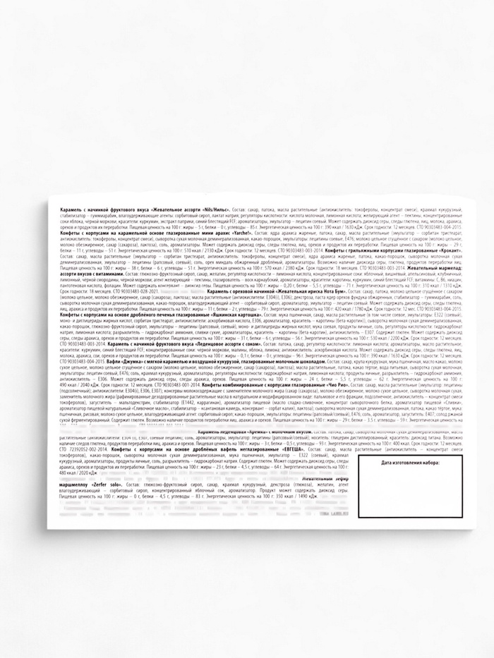 Габариты: 7 x 14,2 x 18 Доставка: Платная Страна: Россия В боксе: 10 шт Состав: См. на упаковке Материалы: см. на упаковке Фасовка: по 1 шт Индивидуальная упаковка: Пакет (БОПП, полиэтилен, ПВХ, дой-пак) Сертификат: ЕАС Набор: Да Цвет: Зелёный Для кого: Для девочки, Для мальчика В наборе, шт.: 2 Вес нетто, г: 500 Вид упаковки: Подарочная коробка Символ года: Нет Тематика праздника: Новый год Адресат: Без адресата Вкус: Ассорти Составляющие набора: Конфеты, Раскраска Вид: Шоколадные Возраст: Для детей ПРИ ОФОРМЛЕНИИ ЗАКАЗА, ПРОСИМ ЗАПРАШИВАТЬ АКТУАЛЬНЫЕ СРОКИ ГОДНОСТИ У МЕНЕДЖЕРА. Карамель с начинкой фруктового вкуса «Жевательное ассорти «Nils/Нильс» Состав: сахар, патока, масла растительные (антиокислитель: токоферолы, концентрат смеси), крахмал кукурузный, стабилизатор – гуммиарабик, влагоудерживающие агенты: сорбитовый сироп, лактат натрия; регуляторы кислотности: кислота молочная, лимонная кислота; желирующий агент – пектины, концентрированные соки яблока, чёрной моркови, красители: куркумин, экстракт паприки, синий блестящий FCF; ароматизаторы, эмульгатор – лецитин соевый. Может содержать диоксид серы, следы глютена, яиц, молока, арахиса, орехов и продуктов их переработки. Конфеты с корпусами на карамельной основе глазированные мини арахис «Yarche!» Состав: ядра арахиса жареные, патока, сахар, масла растительные (эмульгатор – сорбитан тристеарат, антиокислитель: токоферолы, концентрат смеси), сыворотка сухая молочная деминерализованная, какао-порошок, эмульгаторы: лецитины соевые, Е476; молоко цельное сгущённое с сахаром (молоко цельное, молоко обезжиренное, сахар (сахароза), лактоза), соль, ароматизаторы. Может содержать диоксид серы, следы глютена, яиц, орехов и продуктов их переработки. Конфеты с грильяжными корпусами глазированные «Крокант» Состав: сахар, масла растительные (эмульгатор – сорбитан тристеарат, антиокислитель: токоферолы, концентрат смеси), ядра арахиса жареные, патока, какао-порошок, сыворотка молочная сухая деминерализованная, эмульгатор – лецитины (рапсовый, соевый), соль, орех миндаль обжаренный дроблёный, ароматизаторы. Возможно наличие диоксида серы, глютена, продуктов переработки яиц. Жевательный мармелад: ассорти вкусов с витаминами Состав: глюкозно-фруктозный сироп, сахар, желатин, регулятор кислотности – лимонная кислота, концентрированные соки: яблочный, вишнёвый, апельсиновый, клубничный, лимонный, чёрной смородины, чёрной моркови; агент желирующий – пектины, глазирователь – воск карнаубский, ароматизаторы, красители: каротины, куркумин, синий блестящий FCF; витамины: С, В6, ниацин, пантотеновая кислота, фолацин. Может содержать консервант – диоксид серы. Карамель с ореховой начинкой «Жевательная ириска Нота Бум» Состав: сахар, патока, молоко цельное сгущённое с сахаром (молоко цельное, молоко обезжиренное, сахар (сахароза), лактоза); масла растительные (антиокислители: Е304(i), Е306); декстроза, паста ядер орехов фундука обжаренных, стабилизатор – гуммиарабик, соль, сыворотка молочная сухая деминерализованная, какао-порошок, влагоудерживающий агент – сорбитовый сироп, ароматизатор, эмульгатор – лецитин соевый. Может содержать диоксид серы, следы глютена, яиц, арахиса и продуктов их переработки. Конфеты с корпусами на основе дроблёного печенья глазированные «Яшкинская картошка» Состав: мука пшеничная, сахар, масла 