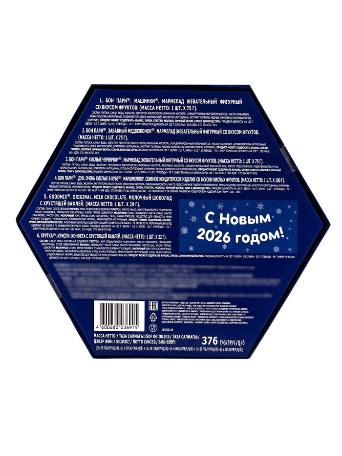 Страна: Россия В боксе: 9 шт Состав: См. на упаковке Материалы: см. на упаковке Фасовка: по 1 шт Индивидуальная упаковка: Цветная картонная коробка Сертификат: ЕАС Для кого: Унисекс В наборе, шт.: 8 Вес нетто, г: 364,5 Тематика: Новогодняя Вид упаковки: Коробка картонная Тематика праздника: Рождество, Новый год Вкус: Фруктовый микс Составляющие набора: Конфеты, Какао, Шоколад, Наклейки, Мармелад Возраст: Для детей Вид: Жевательный Набор новогодний "Бон Пари" — это идеальный способ порадовать себя и своих близких сладкими угощениями в праздничный сезон! Упакованный в стильную и яркую коробку, этот набор весом 364,5 г станет замечательным подарком на Новый год и Рождество, создавая атмосферу уюта и радости. В составе набора вы найдете разнообразные конфеты, которые подарят вам настоящую феерию вкусов. Каждая конфета обладает уникальными ароматами и текстурами, предлагая сладкоежкам поистине незабываемое наслаждение. Разнообразие мармелада добавляет ярких красок и фруктовых ноток, которые так любят дети и взрослые. Кроме того, в набор входит вкусное какао, которое станет идеальным дополнением к зимнему вечеру. Набор "Бон Пари" обязательно станет украшением любого новогоднего стола и порадует всех гостей. Это не просто сладости — это частичка волшебства, которая делает праздники ещё более яркими и запоминающимися. Позвольте себе насладиться изысканными угощениями и поделитесь ими с теми, кто вам дорог! Комментарии к товару