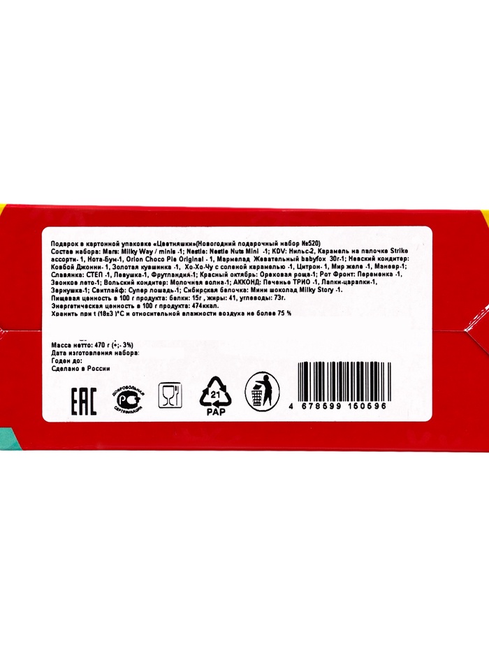 Новогодний подарок «Цветняшки» создан для детей, которые верят, что праздник должен быть ярким и радостным. Эта коробка со сладостями напоминает цветной калейдоскоп — каждая конфета в ней становится частичкой новогоднего волшебства.