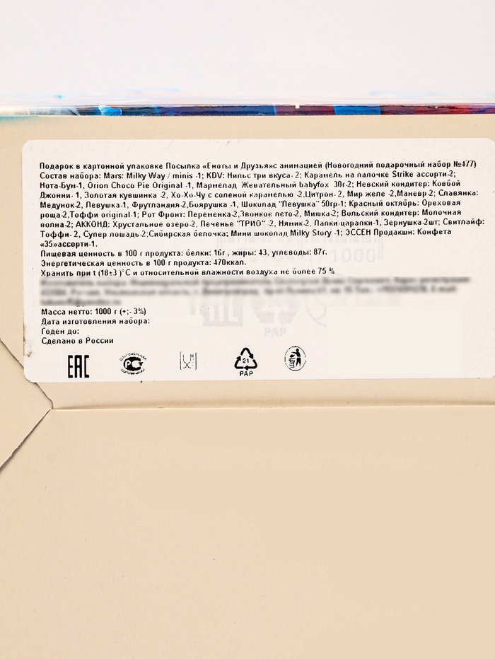 Страна: Россия В боксе: 4 шт Состав: См. на упаковке Материалы: см. на упаковке Фасовка: по 1 шт Индивидуальная упаковка: Подарочная коробка Сертификат: ЕАС Цвет: Разноцветный В наборе, шт.: 53 Вес нетто, г: 1000 Вид упаковки: Коробка картонная Тематика праздника: Рождество, Новый год Составляющие набора: Конфеты Фиксированная цена: Да Дружеская компания в сладком формате Новогодний подарок «Еноты и друзья» весом 1000 г создаёт атмосферу весёлого праздника в кругу друзей. Картонная коробка с забавными персонажами превращает сладости в настоящее приключение.