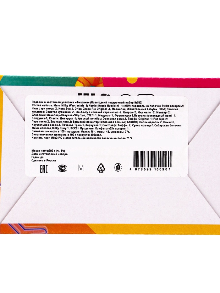 Страна: Россия В боксе: 4 шт Состав: См. на упаковке Материалы: см. на упаковке Фасовка: по 1 шт Индивидуальная упаковка: Без упаковки Сертификат: ЕАС Цвет: МИКС В наборе, шт.: 49 Вес нетто, г: 900 Вид упаковки: Коробка картонная Тематика праздника: Рождество, Новый год Составляющие набора: Конфеты Большой новогодний подарок с Фиксиками создан для настоящих поклонников приключений Нолика и Симки. Эта коробка станет главным сладким открытием под ёлкой — здесь каждая конфета превращается в деталь большого праздничного механизма. Что найдёте внутри
