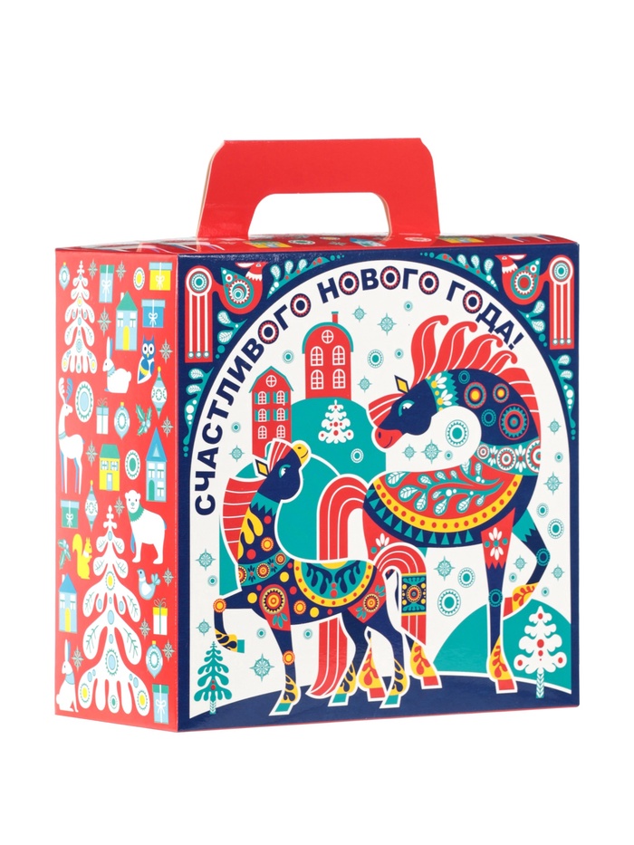 - Подарочная коробка с зимним декором: Плотный картон с красочным новогодним оформлением в стиле «Гжель» смотрится празднично и стильно.