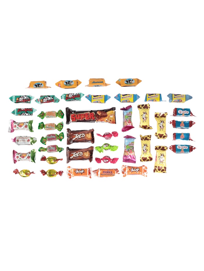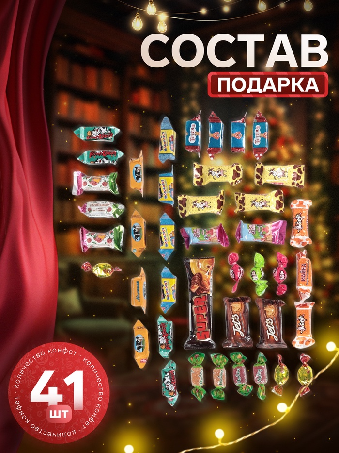 - 41 сладость внутри: Ассорти из конфет. В наборе нет случайных позиций: каждая сладость подобрана для баланса вкусов и текстур.