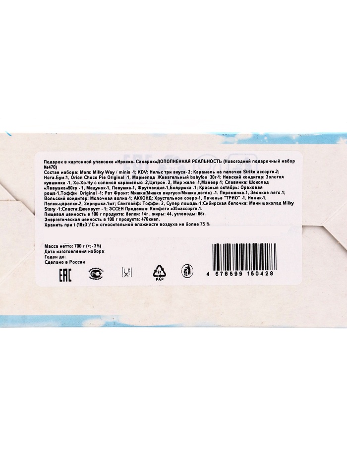Страна: Россия В боксе: 6 шт Состав: См. на упаковке Материалы: см. на упаковке Фасовка: по 1 шт Индивидуальная упаковка: Цветная картонная коробка Сертификат: ЕАС Цвет: МИКС В наборе, шт.: 38 Вес нетто, г: 700 Вид упаковки: Картонная упаковка Тематика праздника: Новый год, Рождество Составляющие набора: Конфеты Новогодний подарок «Ириска-Сахарок» создан для семей, где любят собираться вместе за чаем. Эта коробка со сладостями напомнит о простых радостях — делиться угощениями и создавать праздничное настроение без суеты. Что делает этот подарок особенным