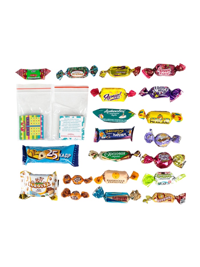 - 22 сладости в наборе: Ассорти конфет с разными вкусами — от классического шоколада до фруктовых наполнителей. Подобранный состав подходит детям и не перегружает объёмом.
