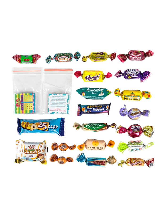 - Компактный формат: Удобный вариант для массовых поздравлений: не занимает много места, легко раздаётся, при этом содержит всё необходимое — от лакомств до развлечения.