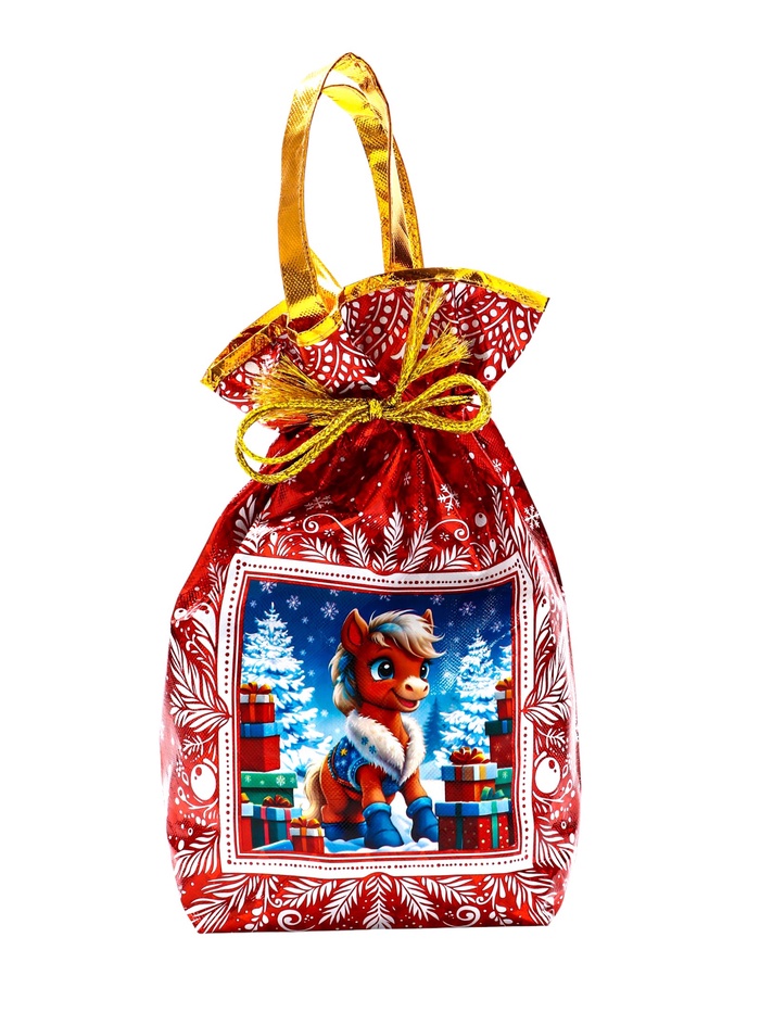 - Тканевый мешок с новогодним дизайном: Упаковка в виде праздничного мешка создает атмосферу чуда. После использования его можно применять для хранения игрушек или как элемент новогоднего декора.