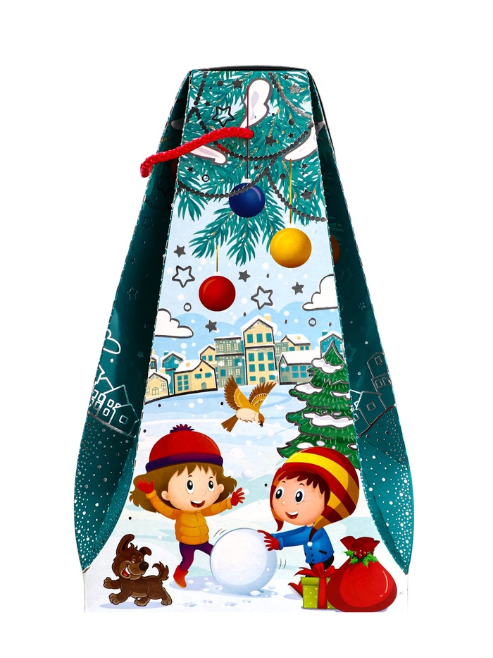 - Картонная коробка с зимним дизайном: Упаковка с новогодней тематикой создает праздничное настроение.