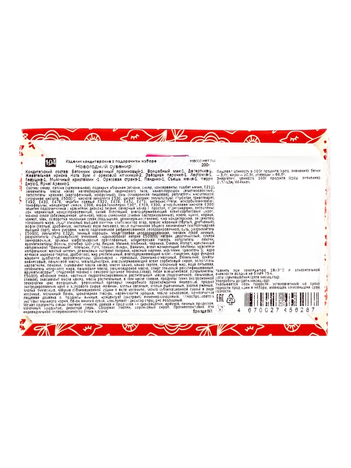 Страна: Россия В боксе: 20 шт Состав: См. на упаковке Материалы: см. на упаковке Фасовка: по 1 шт Индивидуальная упаковка: Без упаковки Сертификат: ЕАС Цвет: МИКС Для кого: Унисекс В наборе, шт.: 14 Вес нетто, г: 200 Вид упаковки: Коробка картонная Тематика праздника: Новый год, Рождество Адресат: Без адресата Составляющие набора: Конфеты Возраст: Для детей Небольшой сладкий набор в новогоднем оформлении подойдёт как самостоятельный подарок или дополнение к основному презенту. Компактный размер и универсальная тематика делают его удобным выбором для детского сада, школы или домашнего праздника. Особенности