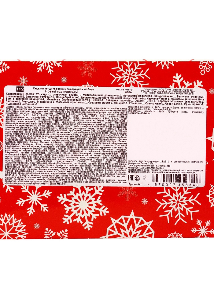 Страна: Россия В боксе: 10 шт Состав: См. на упаковке Материалы: см. на упаковке Фасовка: по 1 шт Индивидуальная упаковка: Цветная картонная коробка Сертификат: ЕАС Цвет: МИКС Для кого: Унисекс В наборе, шт.: 25 Вес нетто, г: 400 Вид упаковки: Коробка картонная Тематика праздника: Рождество, Новый год Адресат: Без адресата Материал: Картон Составляющие набора: Конфеты Возраст: Для детей Сладкий подарок «Новый год повсюду!» — это новогодний набор, в котором сочетаются классические вкусы и яркое оформление. Он подойдёт как для домашнего поздравления, так и для вручения в детском саду, школе или на праздничном утреннике. Такой формат удобен, когда нужно порадовать сразу несколько детей без сложностей с выбором. Особенности