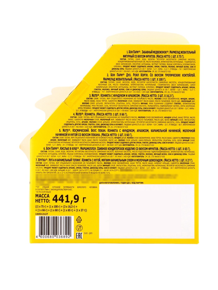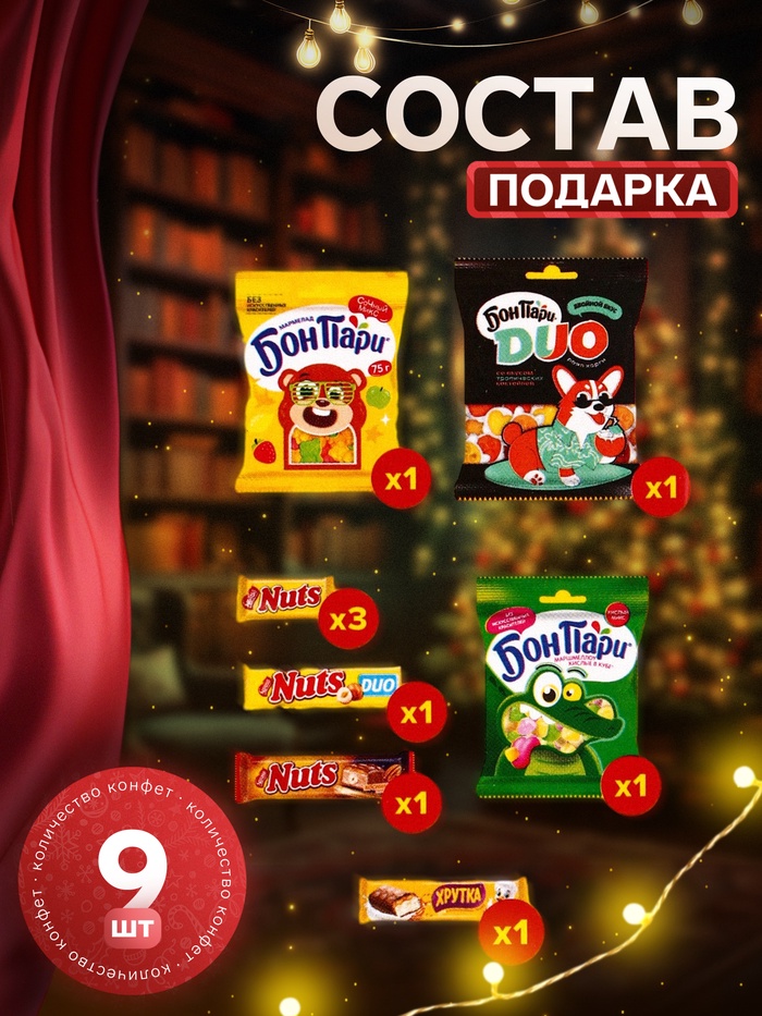 Страна: Россия В боксе: 10 шт Состав: См. на упаковке Материалы: см. на упаковке Фасовка: по 1 шт Индивидуальная упаковка: Без упаковки Сертификат: ЕАС Цвет: МИКС Для кого: Унисекс В наборе, шт.: 9 Вес нетто, г: 442 Вид упаковки: Коробка картонная Тематика праздника: Рождество, Новый год Адресат: Без адресата Составляющие набора: Мармелад, Конфеты, Маршмеллоу Возраст: Для детей Фиксированная цена: Да Снеговик со сладким наполнением. Новогодний подарок NUTS «Снеговик», 442 г — это набор сладостей в фигурной упаковке. Картонная коробка в форме снеговика создаёт узнаваемый зимний образ.