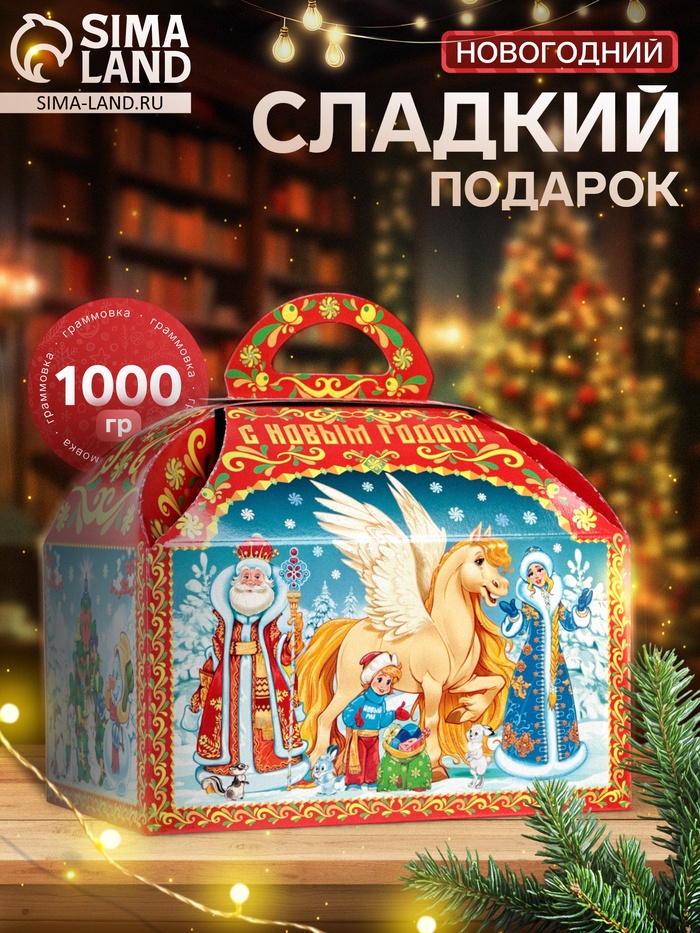 Сладкий набор «Сказочная страна» (1000 г) - это готовый новогодний подарок в оформленной коробке с символом 2026 года. Внутри 62 разнообразные конфеты для детей и взрослых. Подходит для утренников, корпоративов, семейных поздравлений и тематических подарков.