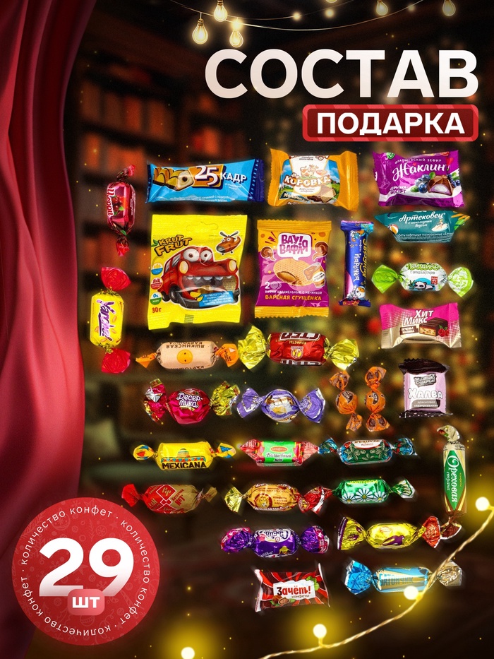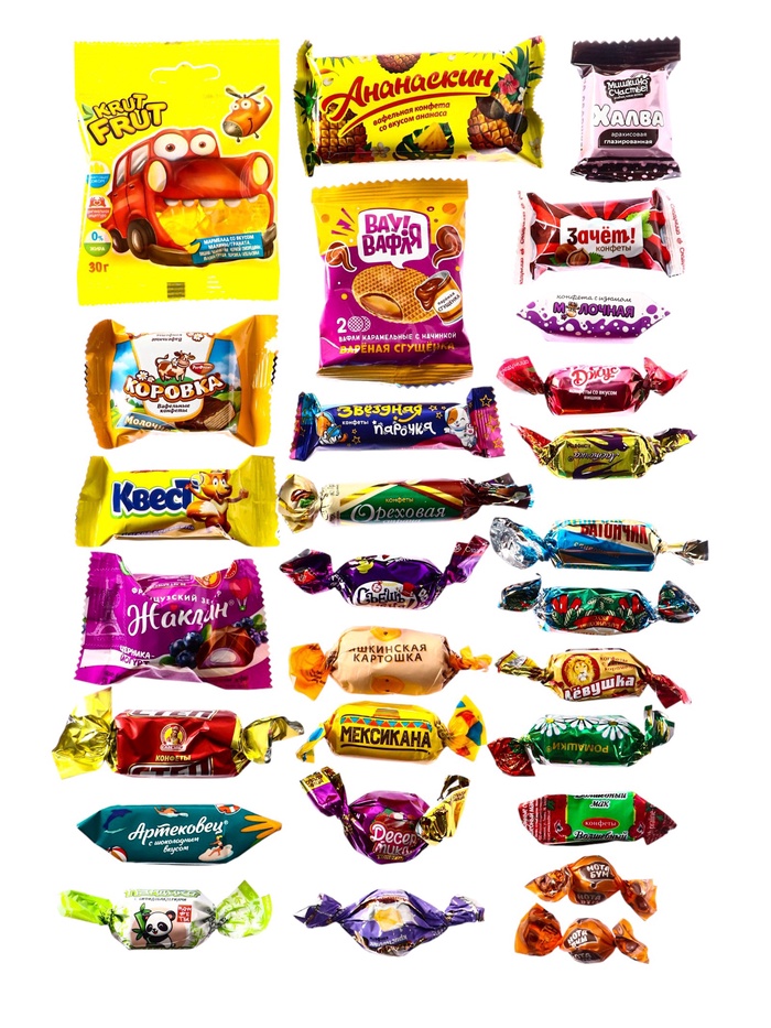 - 29 различных конфет: В мешке собраны разные виды конфет общим весом 500 грамм. Такой ассортимент позволяет пробовать новые вкусы в течение нескольких дней.