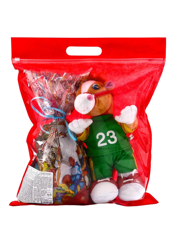 - Тканевый мешок с дизайном символа года: Упаковка оформлена в стилистике символа 2026 года. После использования мешок можно применять для хранения игрушек или как элемент новогоднего декора.