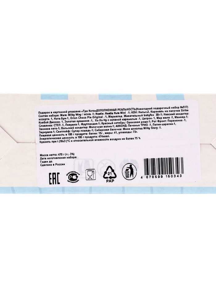 Страна: Россия В боксе: 8 шт Состав: См. на упаковке Материалы: см. на упаковке Фасовка: по 1 шт Индивидуальная упаковка: Цветная картонная коробка Сертификат: ЕАС Цвет: МИКС В наборе, шт.: 26 Вес нетто, г: 470 Вид упаковки: Картонная упаковка Тематика праздника: Рождество, Новый год Составляющие набора: Конфеты Новогодний подарок с Тремя котами создан для детей, которые обожают приключения Коржика, Компота и Карамели. Эта коробка переносит любимых героев прямо под ёлку, превращая обычные конфеты в часть их весёлого мира. Что ждёт внутри