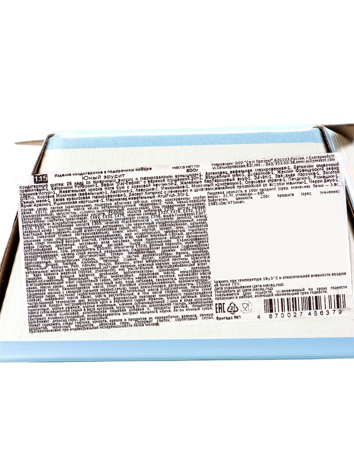 Страна: Россия В боксе: 12 шт Состав: См. на упаковке Материалы: см. на упаковке Фасовка: по 1 шт Индивидуальная упаковка: Без упаковки Сертификат: ЕАС Цвет: МИКС Для кого: Унисекс В наборе, шт.: 29 Вес нетто, г: 500 Вид упаковки: Коробка картонная Тематика праздника: Рождество, Новый год Адресат: Без адресата Материал: Картон Составляющие набора: Конфеты Возраст: Для детей Подарочный набор «Юный эрудит» (500 г) - это сбалансированный новогодний презент для детей, сочетающий сладости и идею интеллектуального праздника. Упаковка оформлена в спокойной тематике, понятной школьникам и любознательным дошкольникам.
