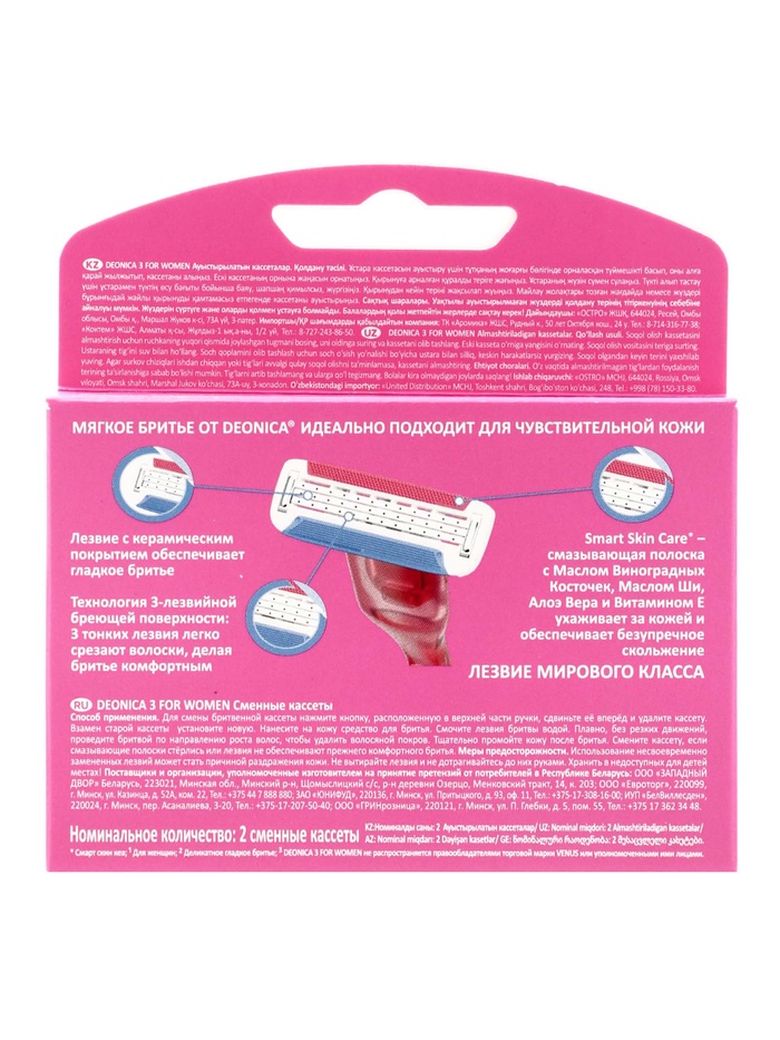 Габариты: 10 x 10,5 x 2 Страна: Россия В боксе: 10 шт Состав: См. на упаковке Материалы: см. на упаковке Фасовка: по 1 шт Индивидуальная упаковка: Без упаковки Сертификат: СТР Набор: Да Для кого: Для женщины В наборе, шт.: 2 Количество лезвий: 3 Вид: Сменные кассеты Фиксированная цена: Да Сменные кассеты DEONICA 3 FOR WOMEN, 3 лезвия, 2 шт. — это удобное решение для поддержания идеальной остроты вашего бритвенного станка. Каждая кассета оснащена системой из трёх острых лезвий, которые бережно и эффективно удаляют волоски, обеспечивая гладкий результат всего за несколько движений. Увлажняющая полоска с мягкими компонентами помогает коже оставаться ухоженной: она улучшает скольжение лезвий, снижает трение и минимизирует риск раздражения. Конструкция кассеты адаптируется к изгибам тела, позволяя без труда обрабатывать даже труднодоступные участки — колени, подмышки или область бикини. Комплект из 2 сменных кассет станет практичным запасом, чтобы ваше бритьё всегда оставалось лёгким и комфортным. Замена занимает всего несколько секунд — просто защёлкните кассету, и станок снова готов к использованию. Преимущества: