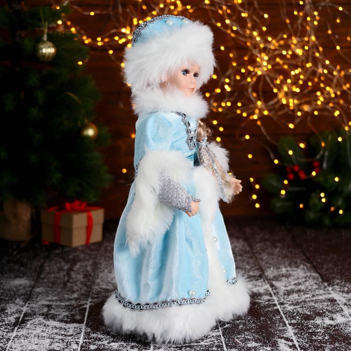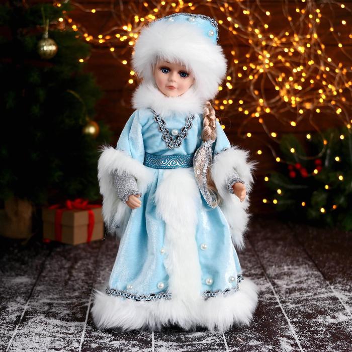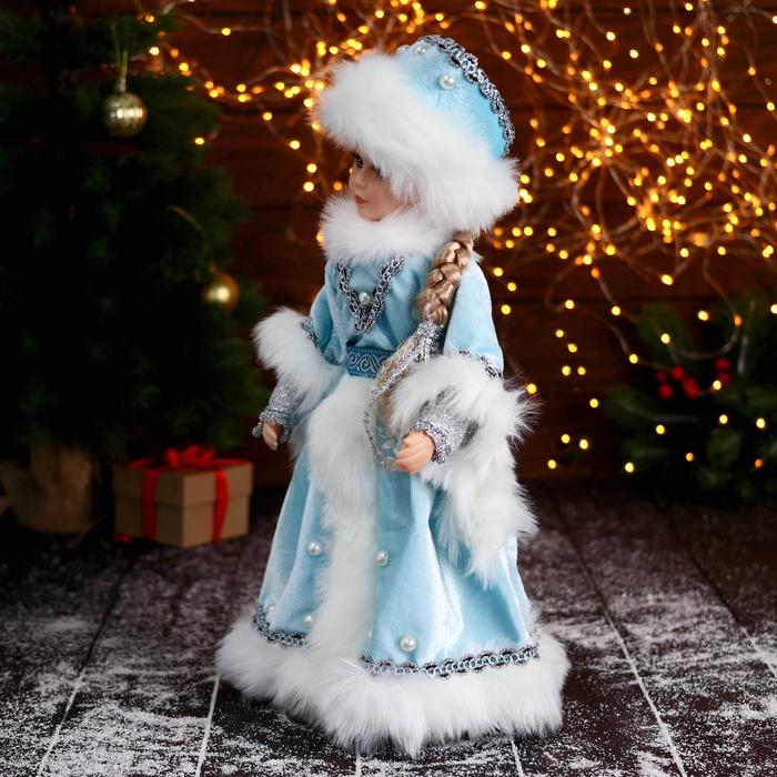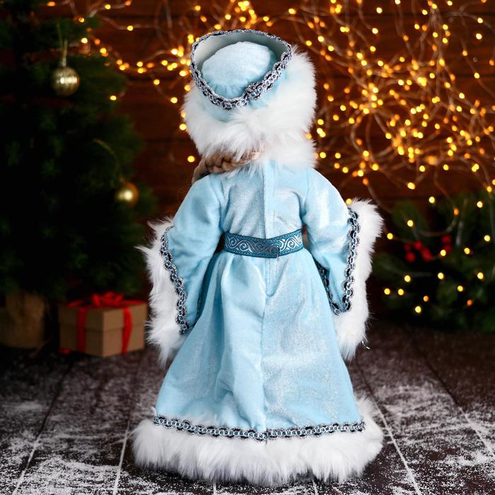 Фигурка Снегурочки высотой 40 см выполнена в стиле советского ретро с элементами шебби-шик, что придаёт ей особый шарм и ностальгическую теплоту. Образ украшен голубой шубкой с бусинками, подчёркивающей изящество и праздничное настроение. Подвижные детали оживляют композицию, создавая эффект живого персонажа без звукового сопровождения и подсветки.