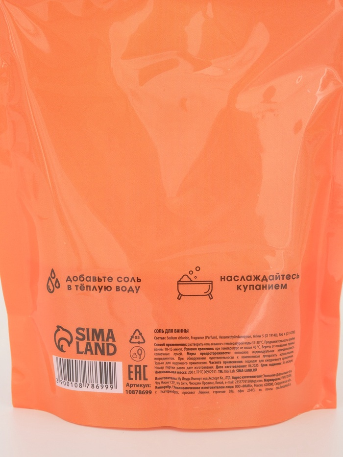 Состав: Sodium chloride, Fragrance (Parfum), Hexamethylindanopyran, Yellow 5(CI 19140), Red 4(CI 14700).