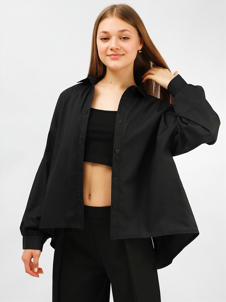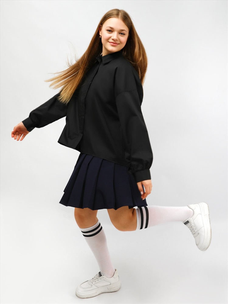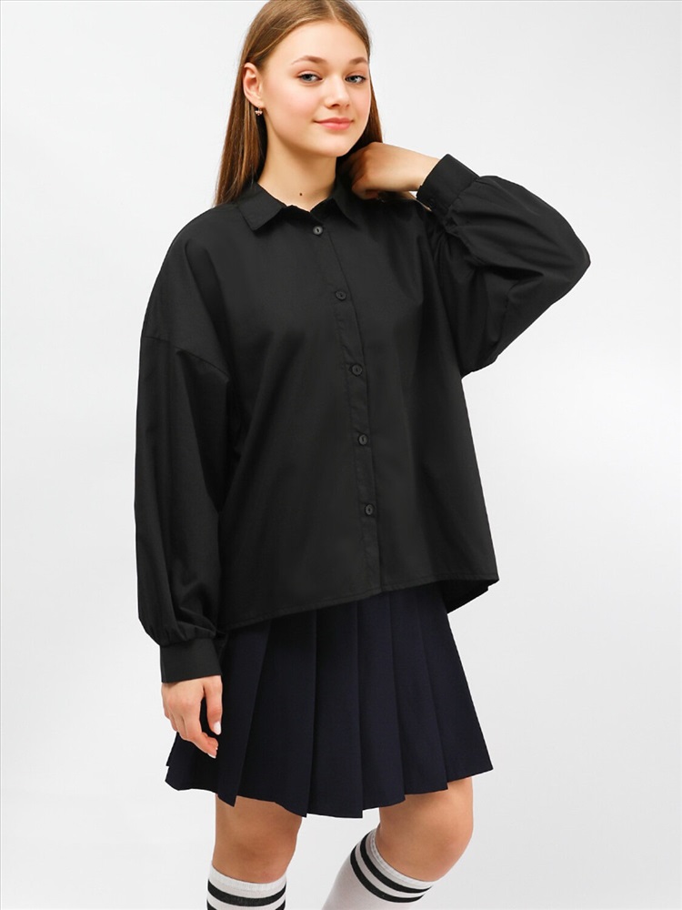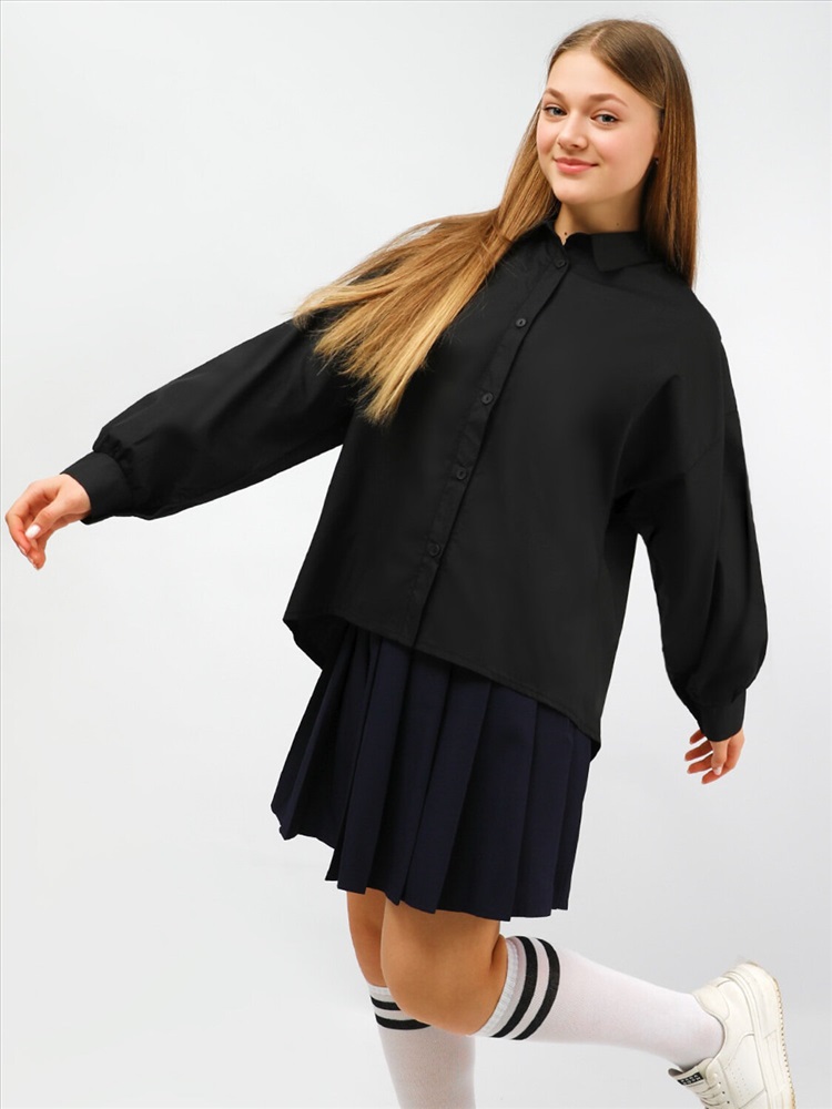 Блузка Соль&Перец модель оверсайз для девочек и подростков на пуговицах. Удлиненная спинка, плечо немного приспущено, рукава заканчиваются манжетой. Блузка прекрасно сочетается как с брюками, так и с юбкой, подчеркнет индивидуальный стиль девочки, и разнообразит ее повседневный школьный образ.