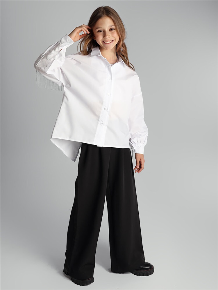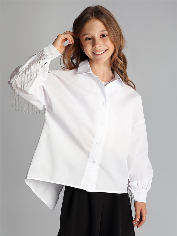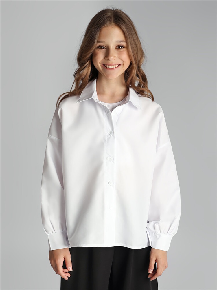 Блузка для девочки Соль&Перец, модель оверсайз, на пуговицах. Удлиненная спинка с эффектным декором и разрезом, рукав-реглан, линия плеча приспущена. Блузка прекрасно сочетается как с брюками, так и с юбкой, подчеркнет индивидуальный стиль девочки, и разнообразит ее повседневный школьный образ.