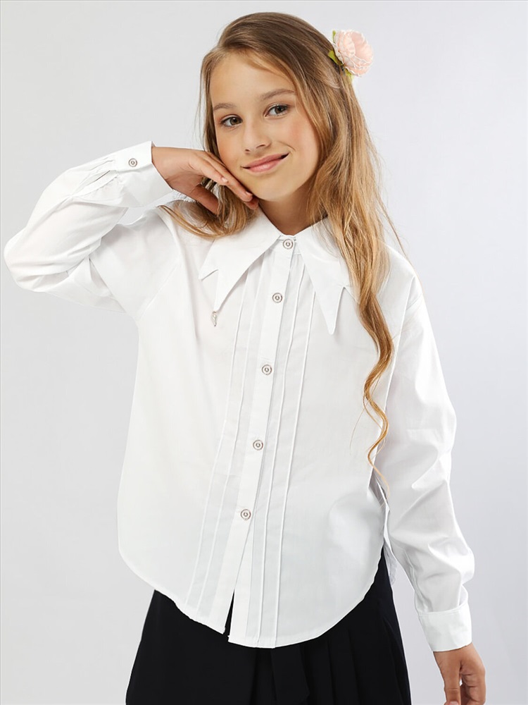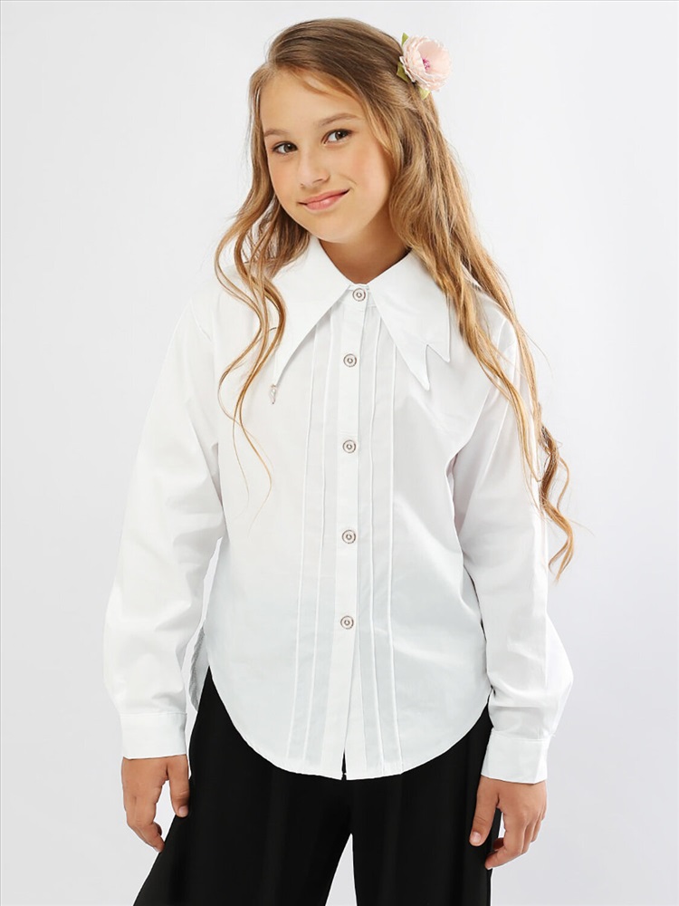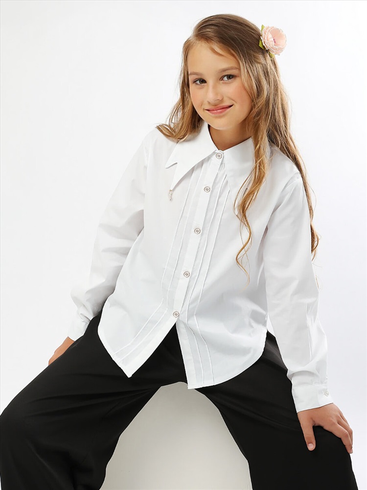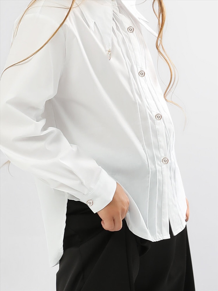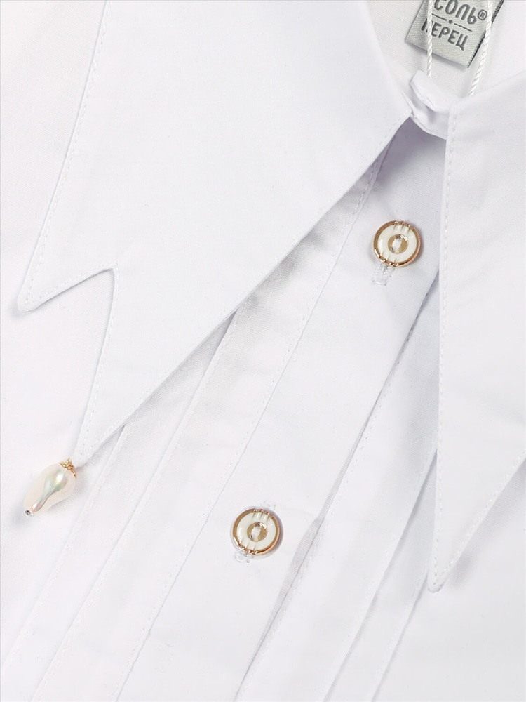 Блузка для девочки Соль&Перец, на пуговицах, из натурального хлопка. Блузка свободного кроя, с удлинённой спинкой. Отложной, фигурный воротник декорирован бусиной со стразами. Пуговицы украшены золотистыми вставками. Классический элемент школьной формы прекрасно дополнит гардероб каждой девочки.
