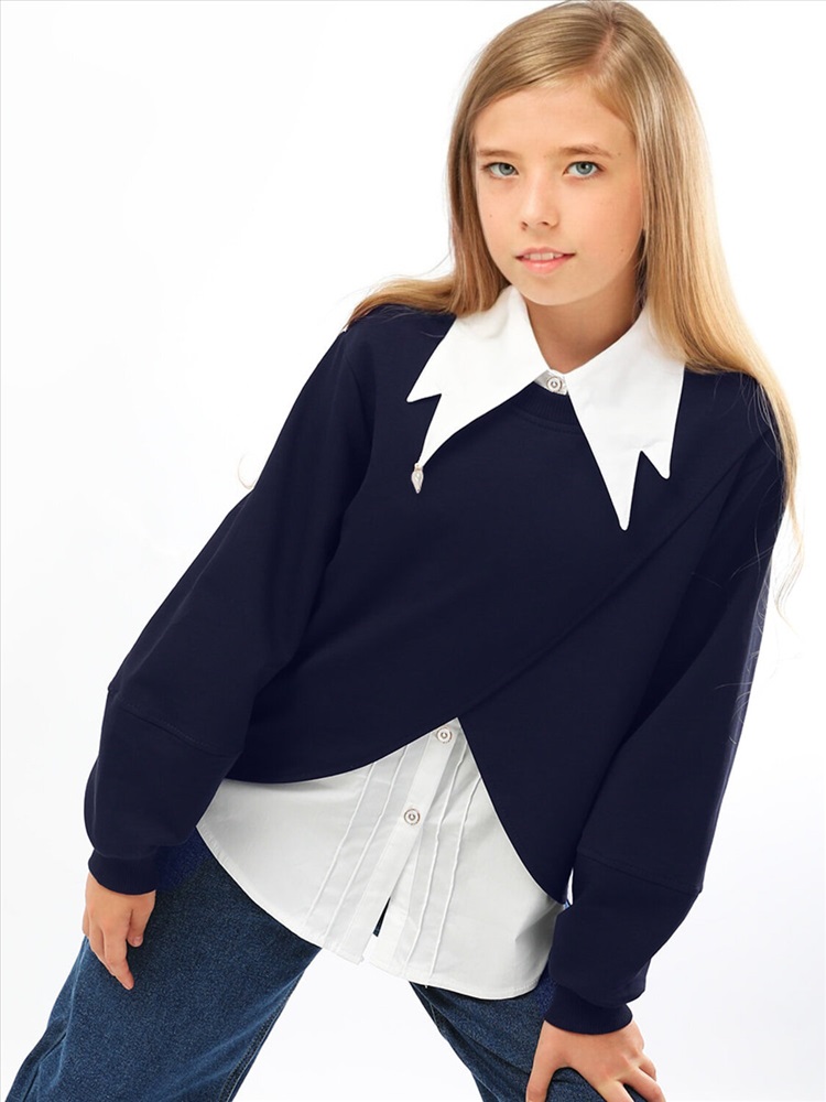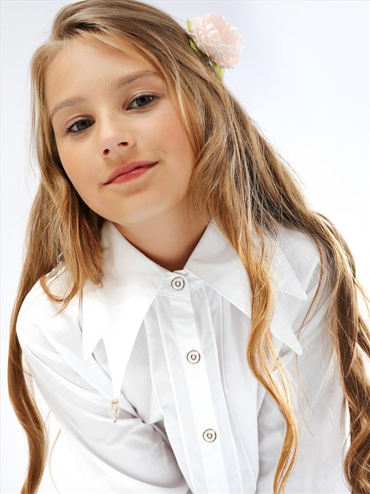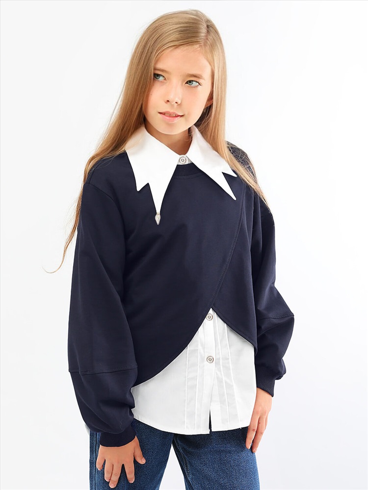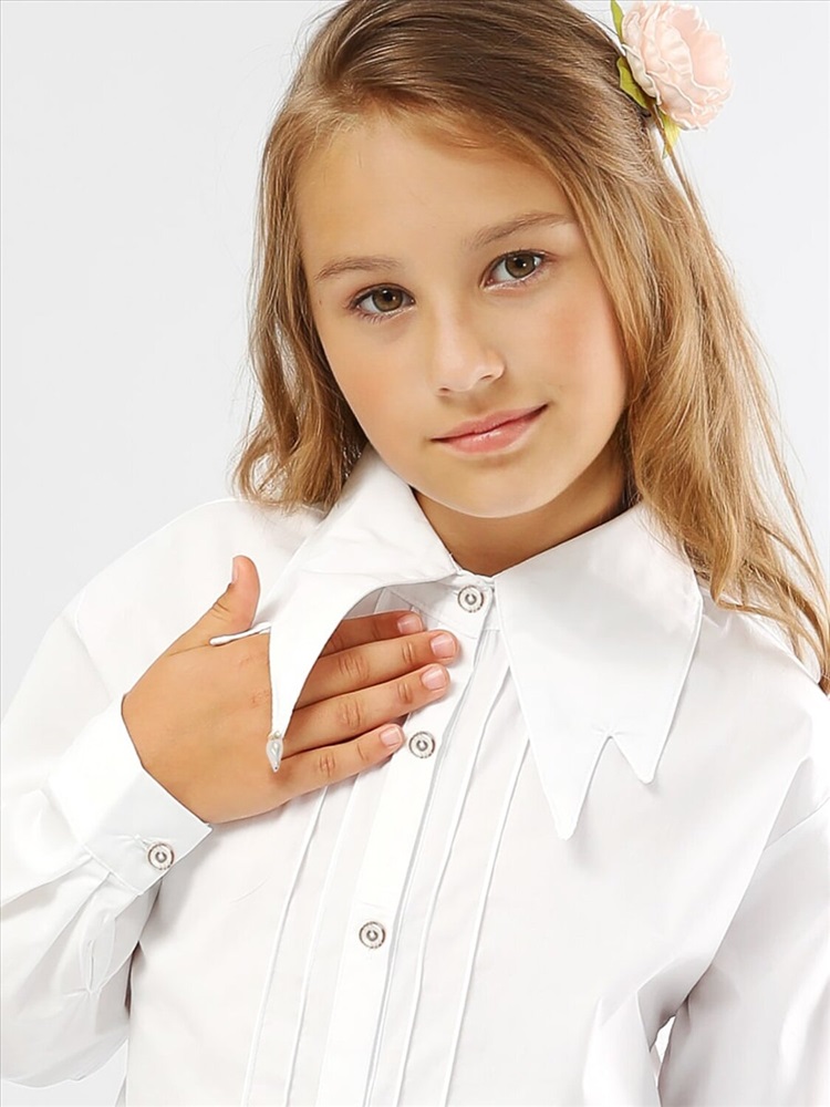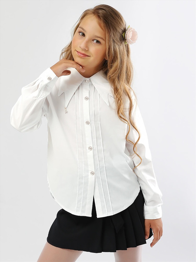 Блузка для девочки Соль&Перец, на пуговицах, из натурального хлопка. Блузка свободного кроя, с удлинённой спинкой. Отложной, фигурный воротник декорирован бусиной со стразами. Пуговицы украшены золотистыми вставками. Классический элемент школьной формы прекрасно дополнит гардероб каждой девочки.