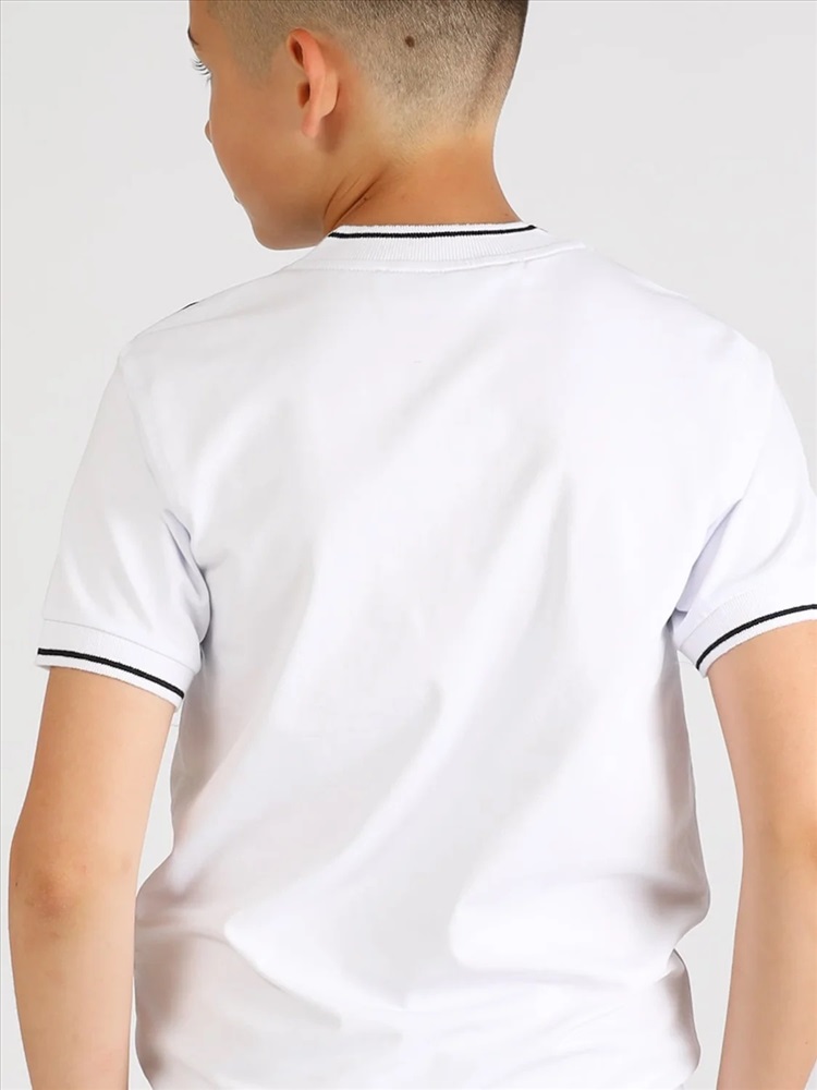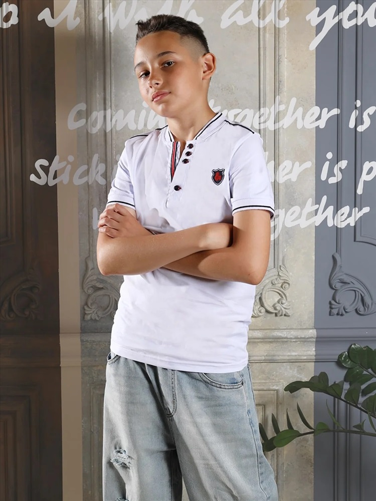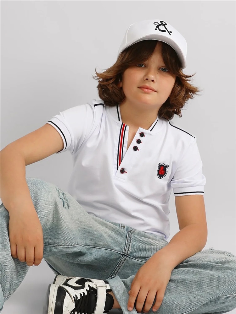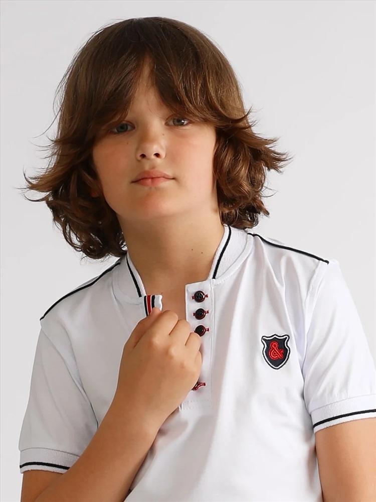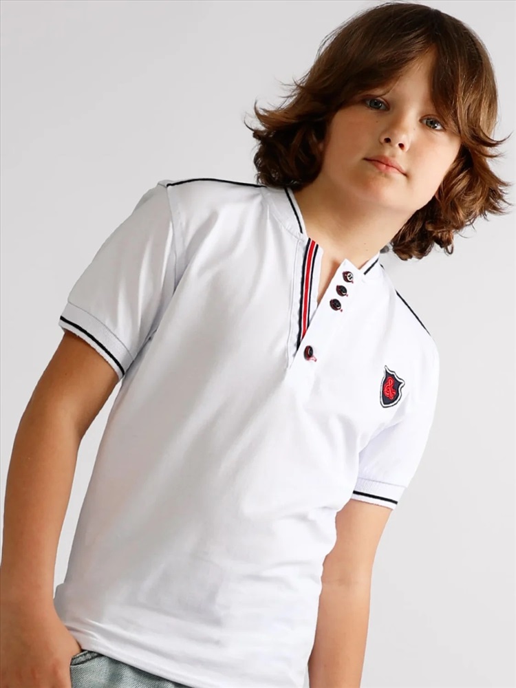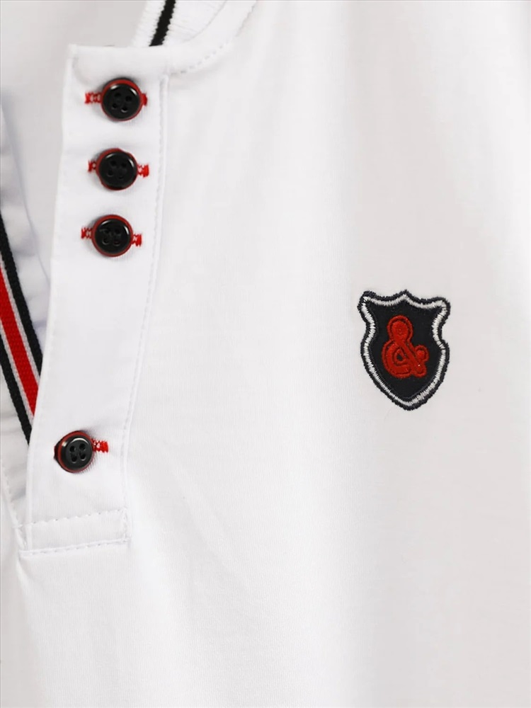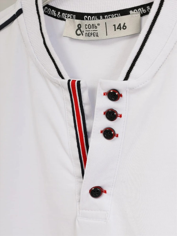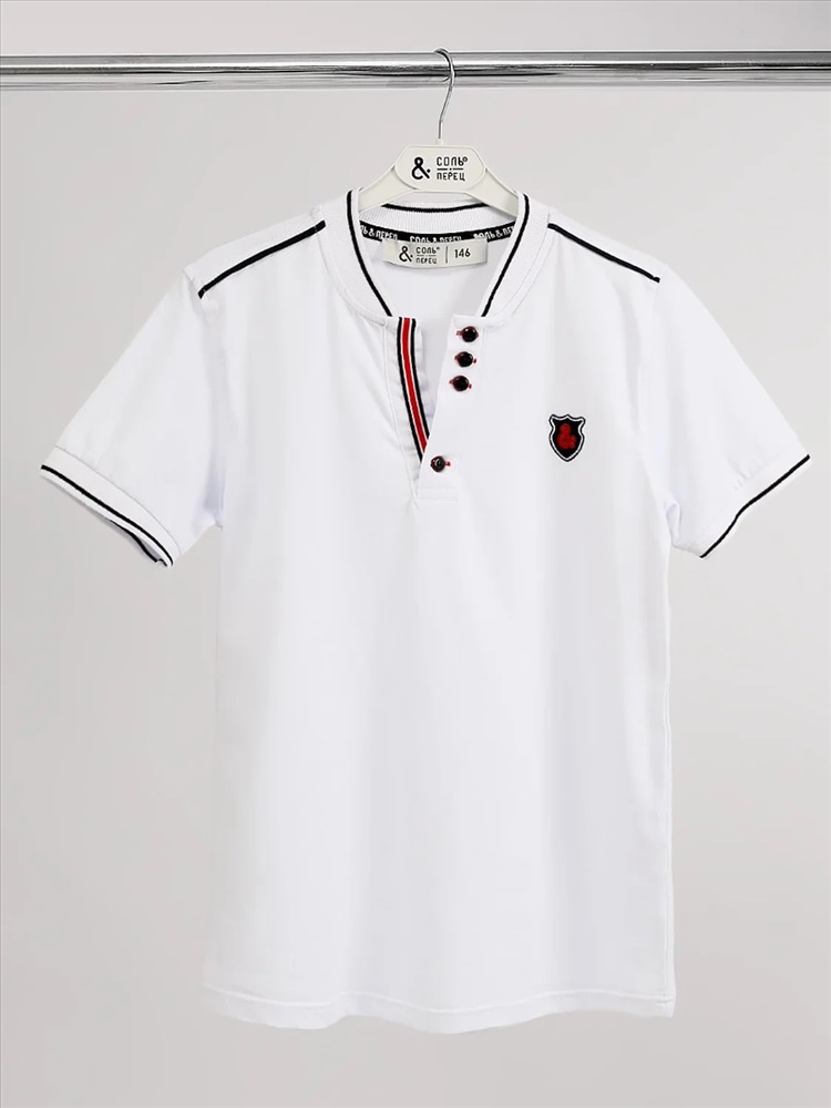 Батник для мальчика Соль&Перец. Футболка-поло для мальчика изготовлена из натурального хлопка с добавлением эластана. Классическая модель прямого кроя с коротким рукавом, воротником-стойкой и V-образным вырезом, который украшен цветной полоской и пуговицами тёмно-синего цвета. На груди вышивка-логотип тёмно-синего цвета. Самый актуальный, универсальный вариант для школы и отдыха.
