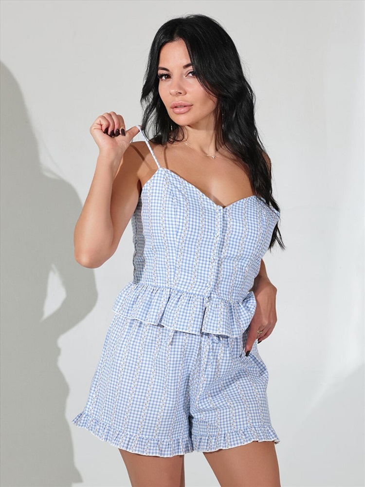 Костюм домашний (топ и шорты) Соль&Перец выполнен из высококачественного 100% хлопка, который обеспечивает отличную воздухопроницаемость, не вызывает аллергических реакций, сохраняет форму после стирки, приятный к телу. Топ на тонких, регулируемых бретелях, передняя часть на пуговицах, задняя часть оснащена эластичной вставкой для идеальной посадки по фигуре. Шорты с эластичной резинкой со шнурком и средней посадкой на талии. Изящные рюши добавляют романтичности и женственности образу. Такой домашний костюм станет идеальным выбором для отдыха, домашних дел и уютных вечеров. В комплекте сумка-мешочек для хранения.