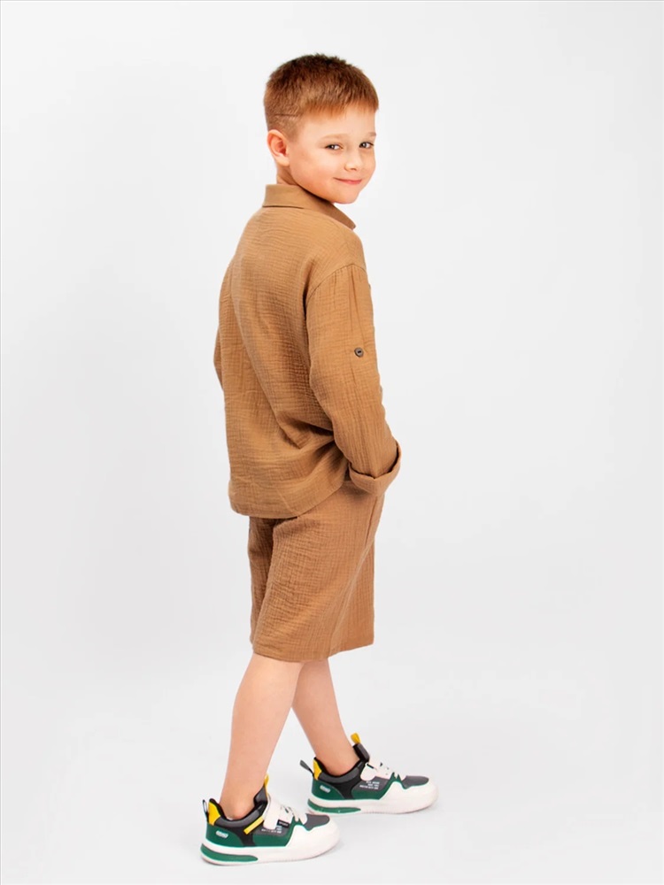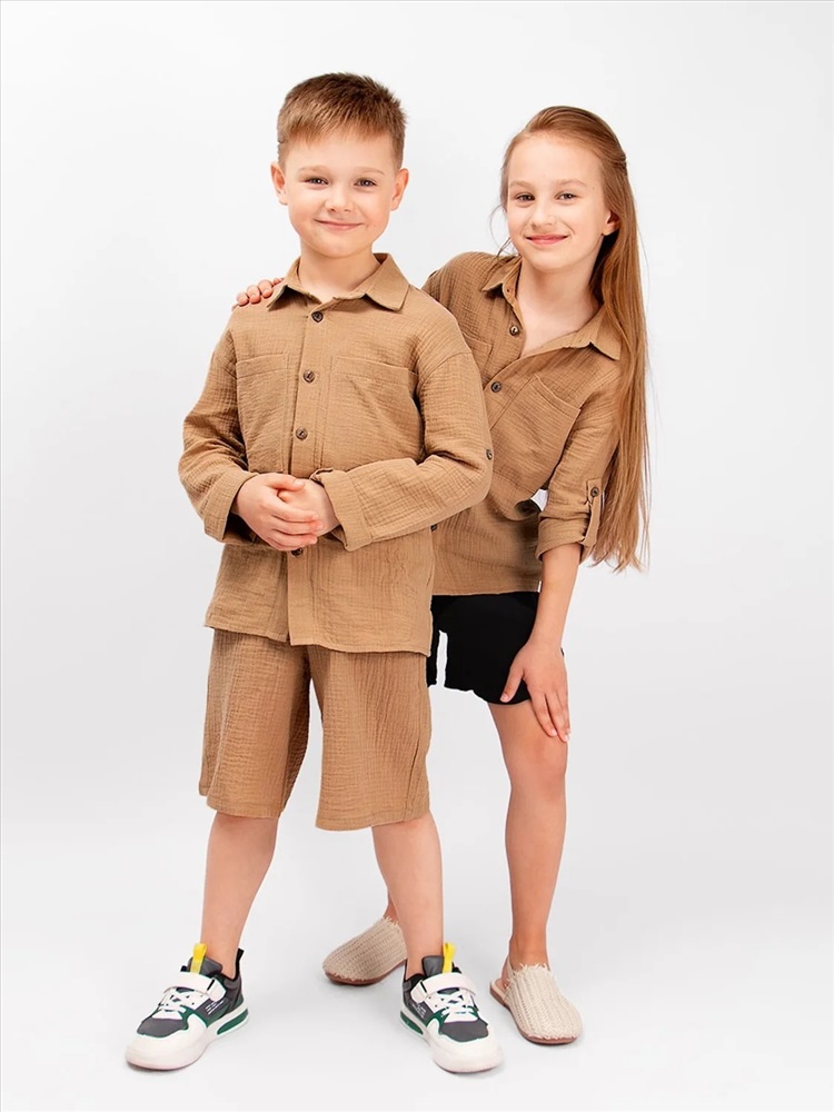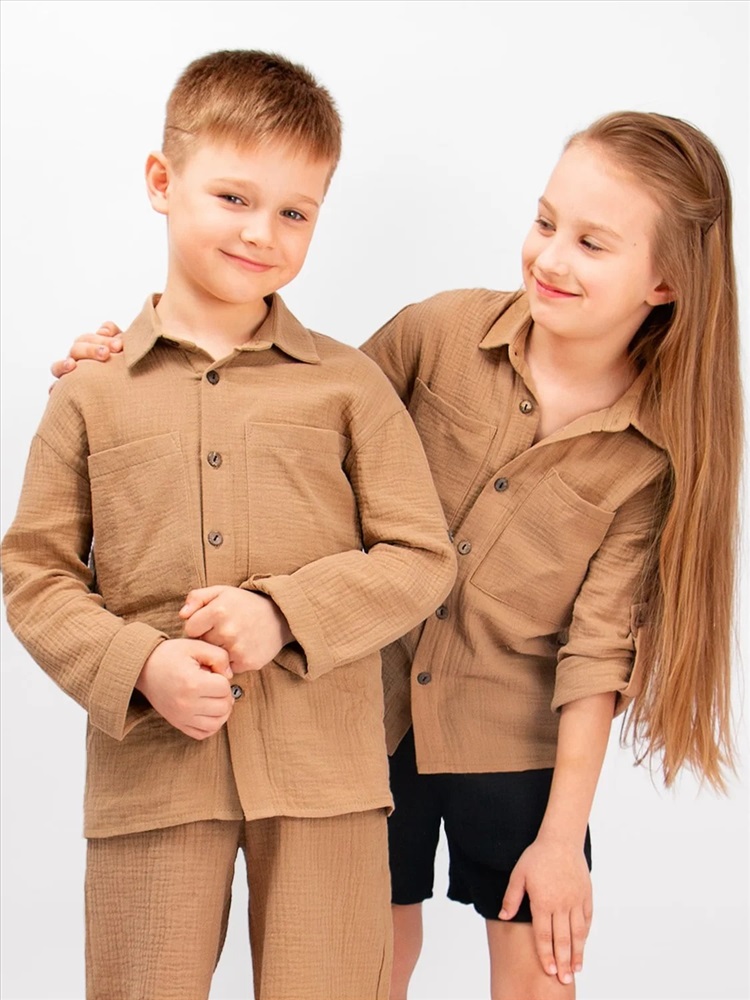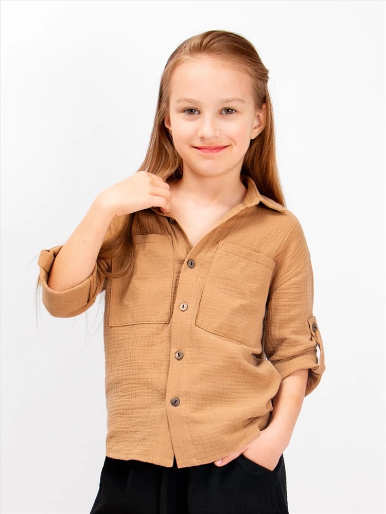 Стильная, детская, подростковая рубашка Соль&Перец свободного кроя. Рукава можно зафиксировать с помощью паты и пуговицы из кокоса. Модель рубашки с накладными карманами. Ткань-двухслойный муслин, хорошо пропускает воздух, защищает от солнца, идеально подходит для чувствительной кожи.